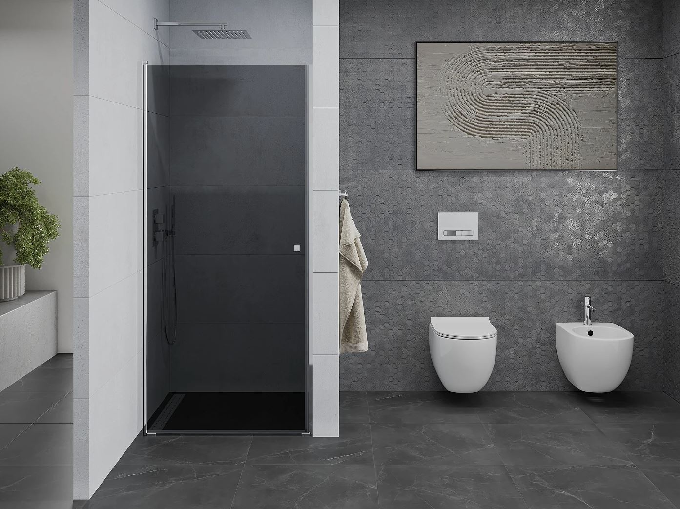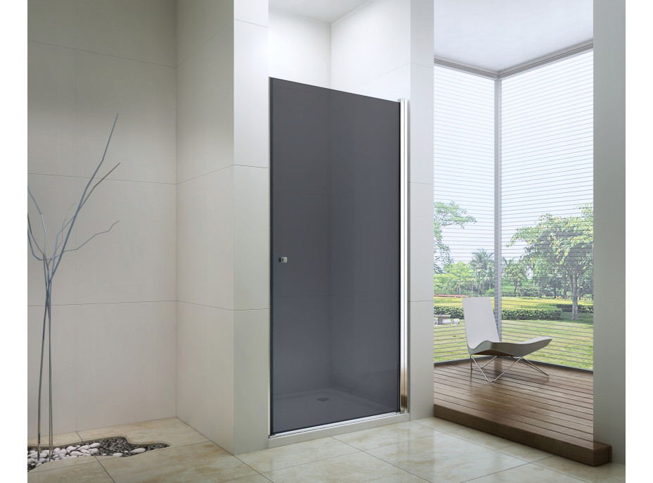 Skvelá voľba do každej kúpeľne. Elegantné sprchové dvere sú vyrobené z 6 mm hrubého tvrdeného skla v dymovom (grafitovom) prevedení. Aplikovaná povrchová úprava skla zaisťuje maximálny komfort všetkým užívateľom. Táto technológia zaručuje jedinečné vlastnosti zabraňujúce znečisteniu skla - povrch stačí iba opláchnuť vodou. Dvere sú uchytené v chrómovanom hliníkovom profile a sú vybavené tesnením zabraňujúcim úniku vody mimo sprchovací kút. Sprchové dvere sú krídlové s možnosťou otvárania dovnútra alebo von (nutné zvoliť pri montáži). Na otváranie slúži decentná kovová rukoväť.