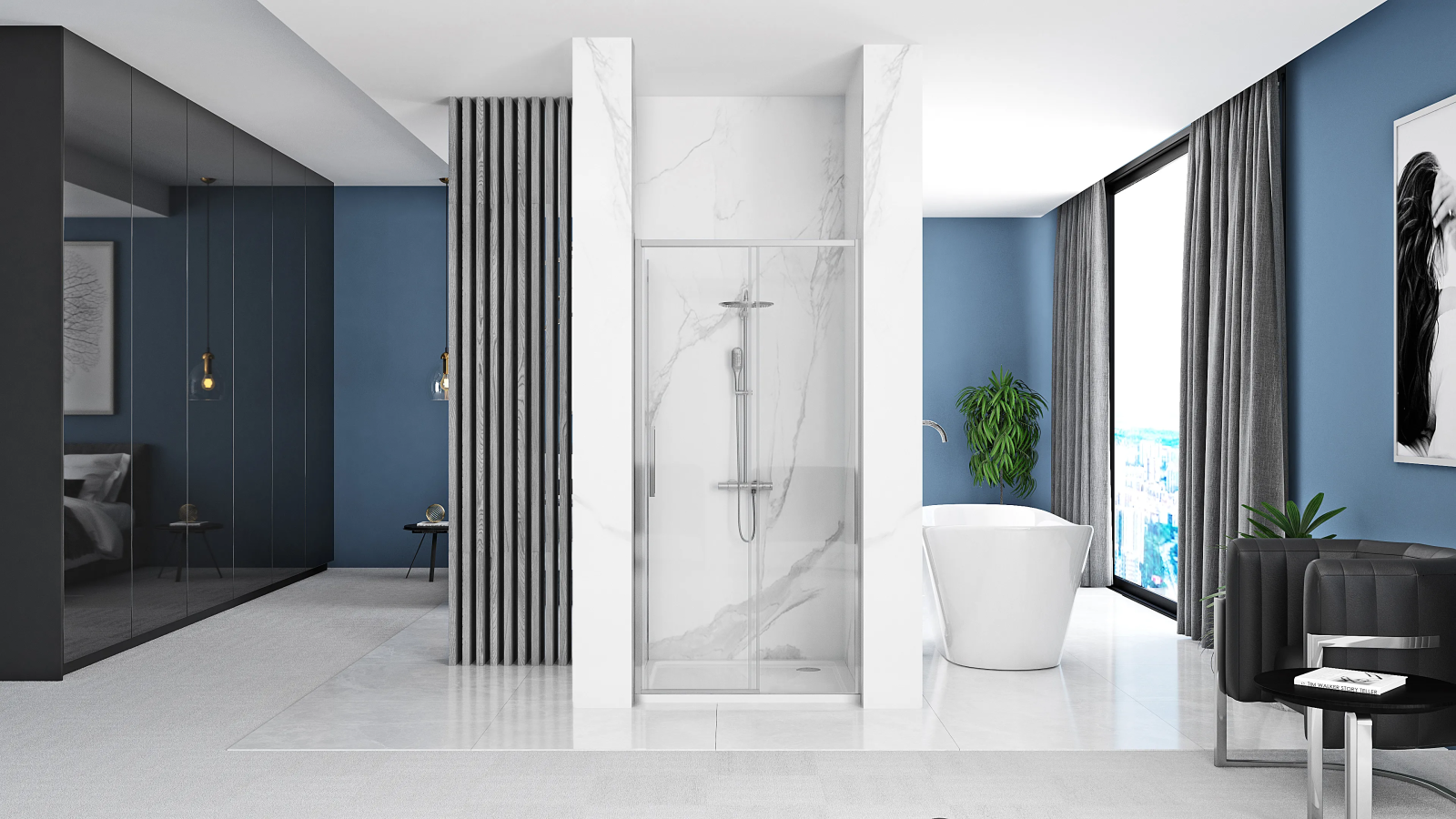 Dvere sú uchytené v chrómovaných hliníkových profiloch a sú vybavené magnetickým uzatváraním a tesnením. Vďaka regulácii v profiloch je možné vyrovnať mierne nerovnosti stien. Podlahová lišta zamedzí vytekaniu vody pod dverami.