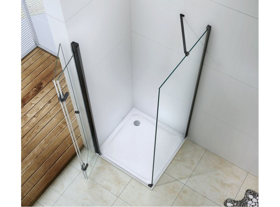 Skvelá voľba do každej kúpeľne. Elegantný sprchovací kút je vyrobený z 6 mm hrubého tvrdeného skla v čírom prevedení. Aplikovaná povrchová úprava skla zaisťuje maximálny komfort všetkým užívateľom. Táto technológia zaručuje jedinečné vlastnosti zabraňujúce znečisteniu skla - povrch stačí iba opláchnuť vodou. Kút je uchytený v čiernych hliníkových profiloch a je vybavený tesnením zabraňujúcim úniku vody mimo sprchovací kút. Dvere sprchového kúta sú skladacie (dve sklá spojené kvalitnými pántami s možnosťou zloženia dovnútra aj von). Na otváranie slúži decentná kovová rukoväť.