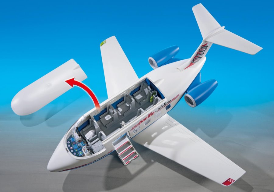 Cestujúci môžu nastupovať do pripraveného lietadla. Strecha a zadná časť lietadla možno otvoriť.