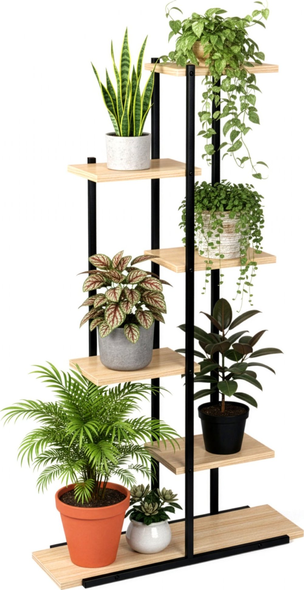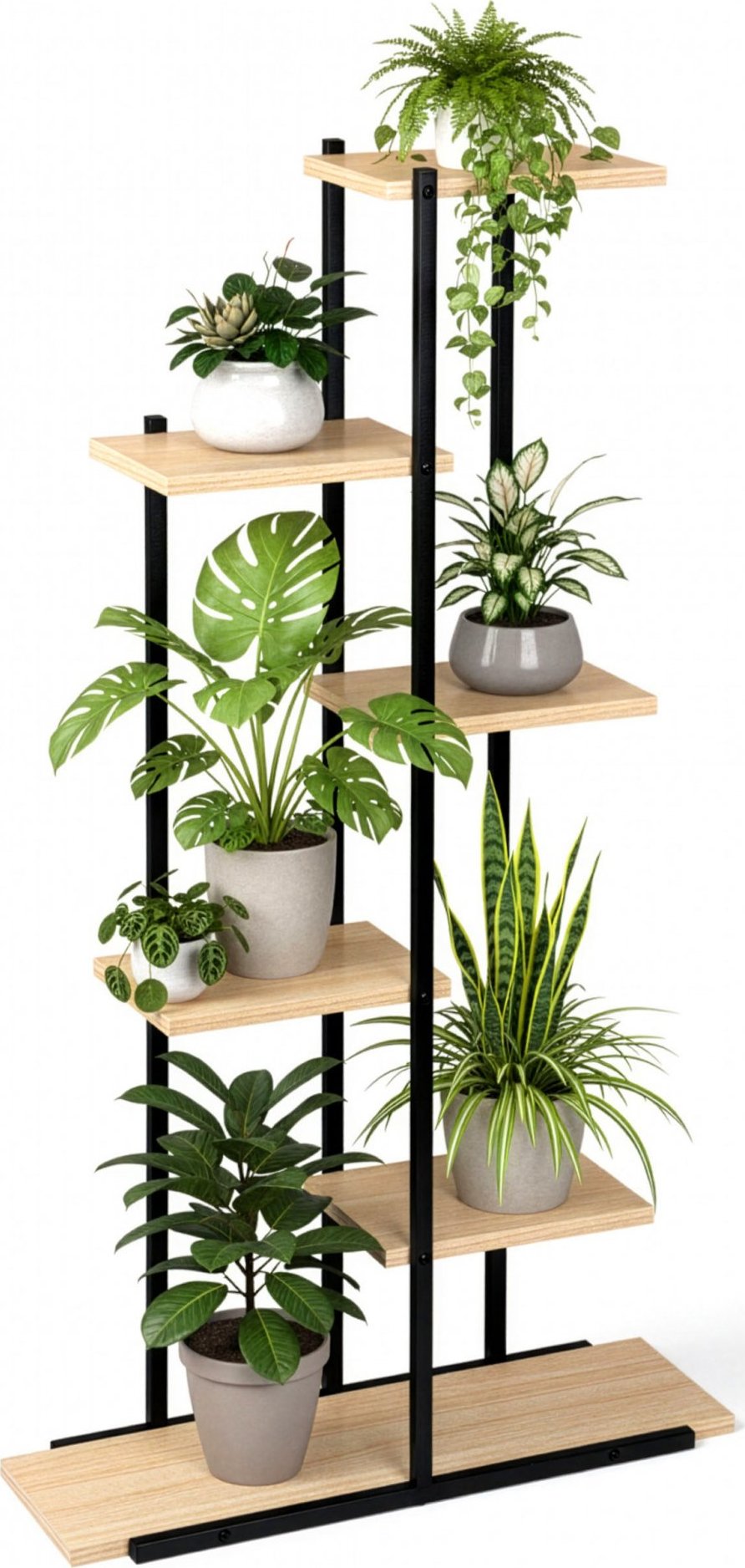 Stojan na kvety Iker Vanilla Craft je perfektným riešením pre tých, ktorí chcú do svojho interiéru vniesť harmóniu, estetiku a poriadok. Vďaka šesťposchodovému dizajnu – vrátane siedmich stojanov – získate viac priestoru pre svoje obľúbené rastliny bez toho, aby ste zaberali cennú podlahovú plochu. Stabilný kovový rám a police v remeselných farbách nielenže vyzerajú krásne, ale taktiež zaisťujú bezpečnosť a odolnosť. Tento kus nábytku vytvorí útulnú atmosféru a zároveň usporiada zeleň vo vašej domácnosti – bez obáv z naklonenia alebo poškriabania podlahy.