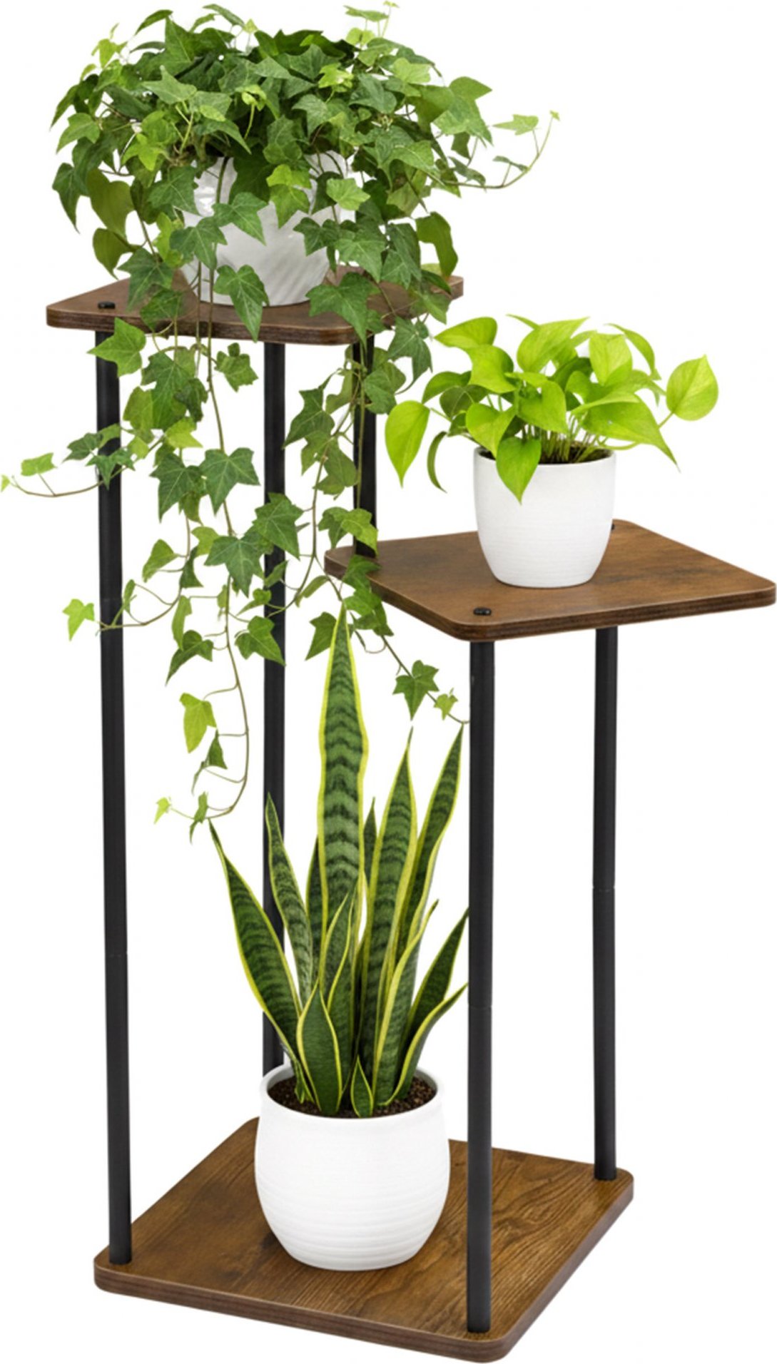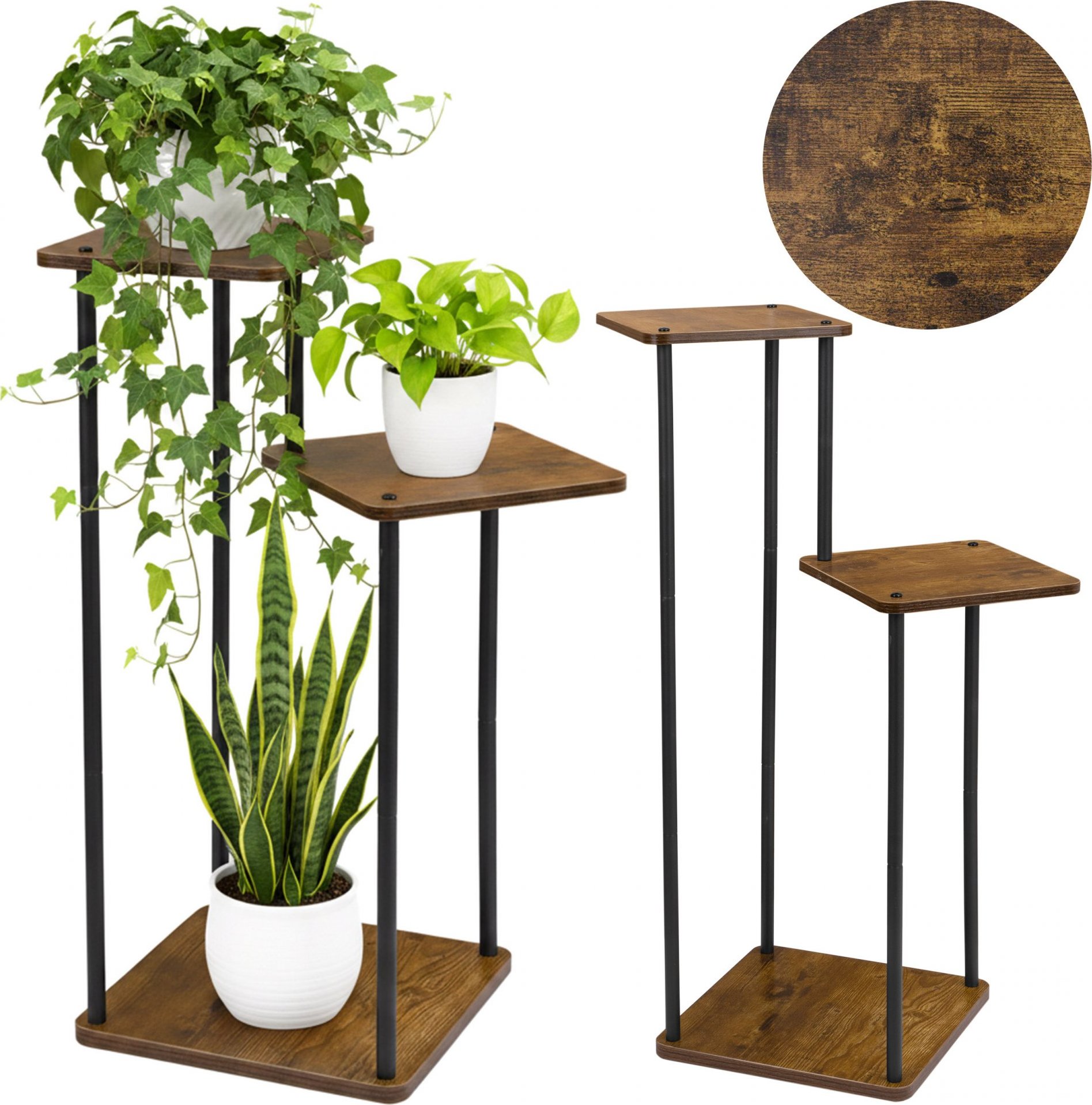 Stojan na kvety Tomas Rustic kombinuje štýl a funkčnosť, takže je ideálny na prezentáciu rastlín. Zjednodušuje organizáciu priestoru, umožňuje vám vystaviť vaše obľúbené kvety a vnáša do vášho interiéru teplú rustikálnu atmosféru v loftovom štýle. Jeho stabilná konštrukcia a tri úrovne umožňujú umiestnenie viacerých rastlín bez toho, aby zaberali veľkú podlahovú plochu, zatiaľ čo kombinácia čiernej ocele a panelu vo farbe dubového dreva dodáva stojanu aj dekoratívny charakter.