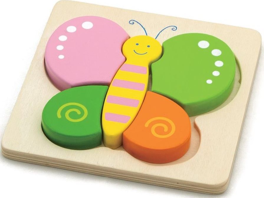 Puzzle pre deti, ktoré rady skladajú - kvalitne spracované a vyrobené z tradičného materiálu. Drevené puzzle v jasných farbách s motívom motýlika zaujme každé dieťa. Veľké oblé dieliky zaisťujú jednoduchú a bezpečnú manipuláciu. Vďaka doske s vyfrézovaným obrysom dieťa samo spozná správnosť umiestnenia dielikov. Skladanie dielikov v celok pomáha rozvoju koordinácie, fantázie aj jemnej motoriky a dieťaťu poskytuje zábavu aj radosť z úspešného splnenia úlohy. Odporúčané pre deti od 2 rokov. Rozmer zloženého puzzle cca 12 x 11 cmVlastnosti