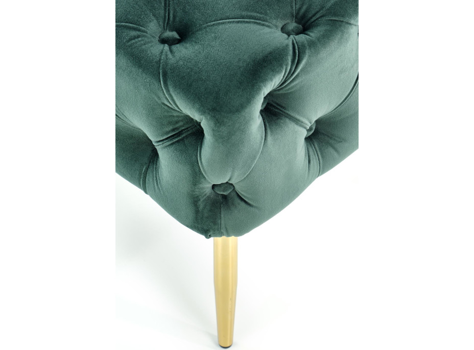 Štýlový taburet v glamour štýle je ideálny pre tých, ktorí hľadajú jedinečný kus nábytku pre svoju spálňu, predsieň alebo obývaciu izbu. Jeho zamatová zelená látka a chrómová oceľ zaisťujú vysokú kvalitu a elegantný vzhľad. Štýlové prešívanie pokrýva celú plochu sedadla a bočníc, čo spolu s hlbokými gombíkmi pridáva taburetu exkluzívny dizajn. Chrómované nohy zaisťujú stabilitu a zlatá farba dodáva nohám nádherný vzhľad.