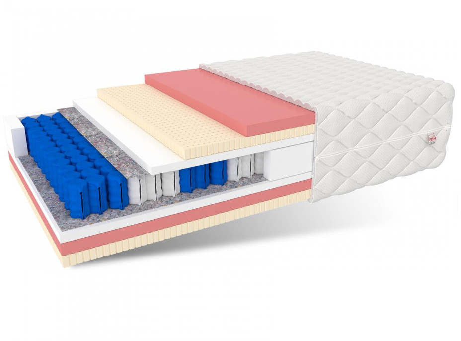 Zloženie matraca: taštičkové pružiny, polyuretánová pena s hustotou 25 kg / m3, prírodné filc, latexová vrstva (20% prírodný latex s hustotou 60kg / m3, 80% syntetický latex s hustotou 60 kg / m3), termoplastická pamäťová pena s hustotou 30 kg / m3