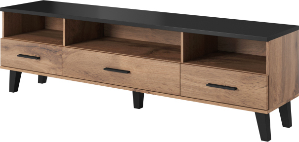 Jednoduchý a elegantný televízny stolík v škandinávskom štýle sa hodí do každého interiéru. Skladá sa z 3 spodných šuplíkov s 3 otvorenými policami nad nimi. Lamino dosky, z ktorých je stolík vyrobený, sú kvalitné, stabilné a dlho vydržia. 15 cm vysoké nožičky dodávajú stolíku moderný vzhľad. Stolík je vyrábaný v dekore dub wotan v kombinácii s čiernou farbou.