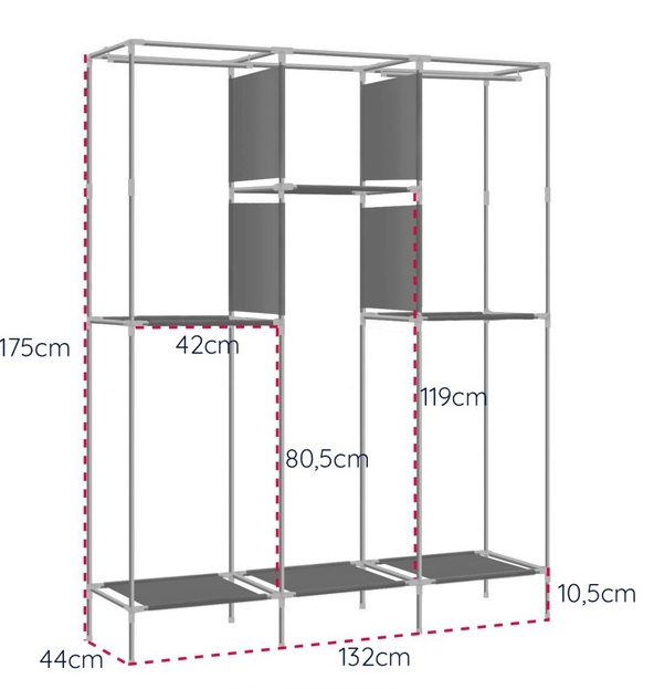 Táto jednoduchá, ale veľmi pevná a priestranná textilné šatníková skriňa má moderný vzhľad a variabilné vnútorné usporiadanie políc. Stabilná konštrukcia umožňuje vložiť veľké množstvo vecí. Otváranie skrine je na zips. Skriňa je vyrobená zo silnej netkanej látky, ktorá je veľmi odolná aj ľahká a ľahko sa čistí.