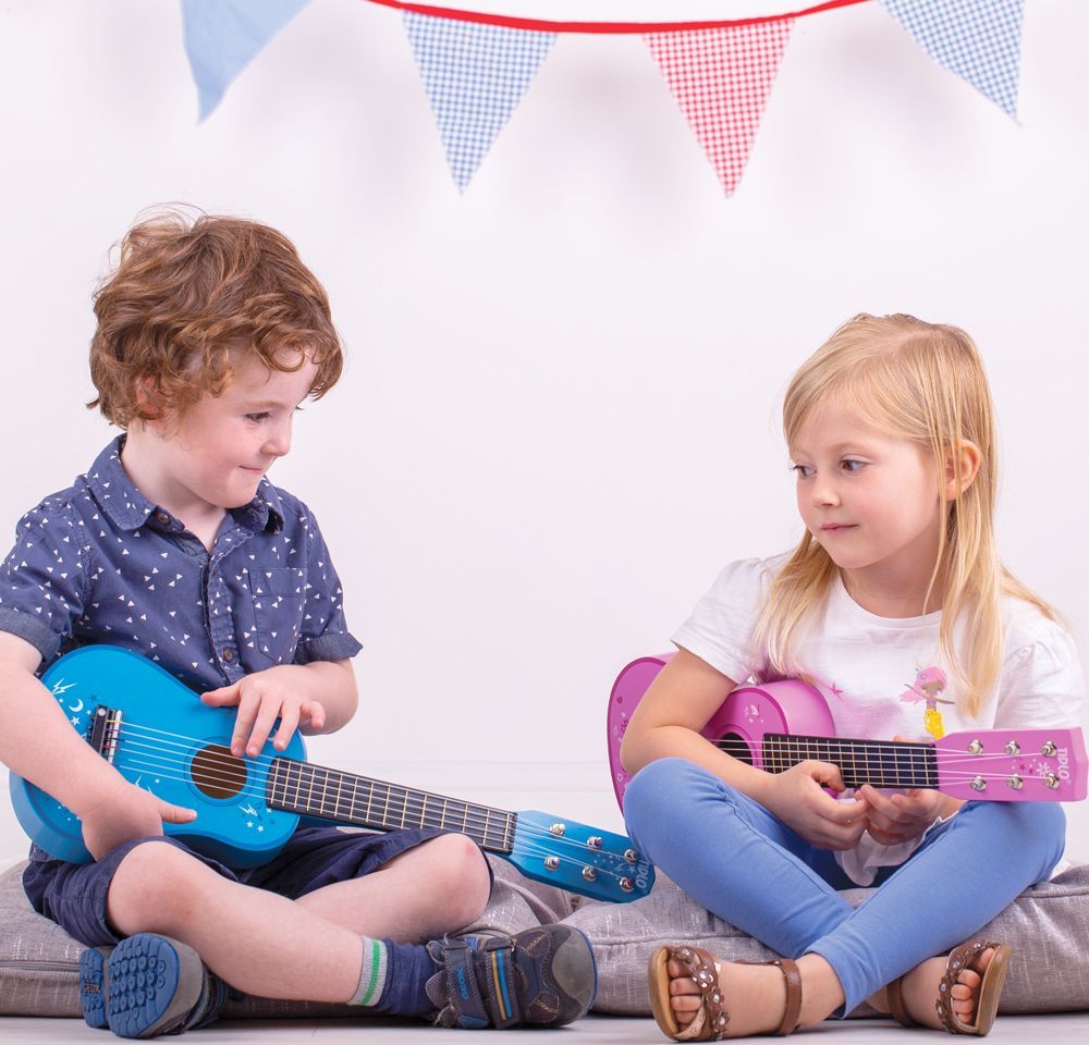 Klasická drevená akustická gitara so šiestimi strunami môže byť naladená ako pravá. Gitara má natiahnuté nylonové struny, v balení s trsátkom na vybrnkávanie. Je vyrobená z odolného dreva a bude tak ideálnou prvou akustickou gitarou Vášho dieťaťa - nastávajúceho hudobníka. Deti si užijú zábavu, keď budú predvádzať koncert svojej obľúbenej rockovej alebo popovej hviezdy, bude to show pre celú rodinu! Krásna modrá gitara s hviezdami je veľká tak akurát pre detské ruky. Deti sa vďaka nej naučia rytmu a časovaniu. Podporuje senzorickú a kreatívnu hru. Túto hračku nemožno pokladať za hudobný nástroj. Vyrobené z kvalitných materiálov zo zodpovedných zdrojov. Zodpovedá európskej bezpečnostnej norme.