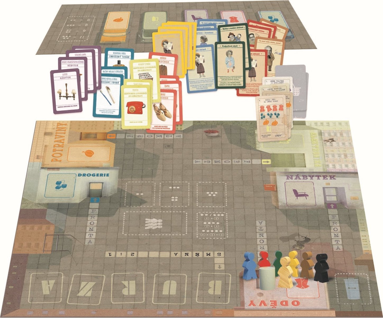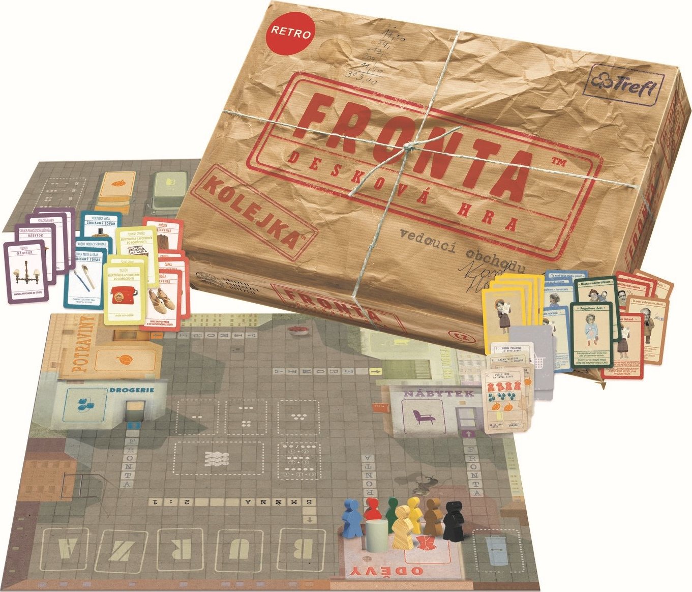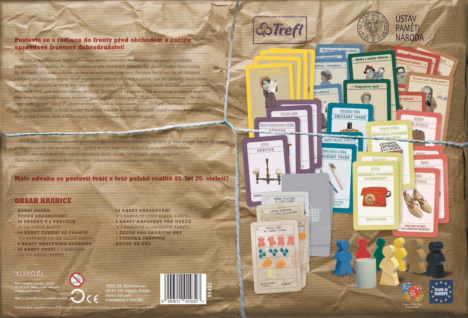 Postavte sa s rodinou do radu pred obchodom a zažite skutočné frontové dobrodružstvo. Fronta je stolová hra, ktorá znázorňuje realitu všedného života počas rokov úpadku poľského komunistického režimu. Na prvý pohľad sa zdá úloha hráčov jednoduchá: musíte členov rodiny poslať do obchodu, aby nakúpili všetko, čo majú na nákupnom zozname. Problém tkvie v tom, že päť blízkych obchodov má prázdne regály. Hráči postavia svojich pešiakov do frontu a netušia, či do obchodu tovar vôbec dorazí. Napätie rastie vo chvíli, keď sú odhalené karty a je jasné, že tovaru bude dostatok iba pre pár šťastlivcov, ktorí stoja najbližšie k dverám obchodu. Každý chce byť prvý a ľudia sa začínajú posúvať dopredu. Aby sa hráči pretlačili frontom dopredu, používajú karty ako napr.: "Matka s malým dieťaťom", "To nie je vaše miesto, pane!" alebo "Podpultový tovar". Hráči si musia dávať pozor na karty "Zatvorené - inventúra", "Chyba zásobovania" a čierne figúrky, ktoré stoja v každom fronte - šmelinára. Domov s nákupom sa úspešne vrátia iba tí hráči, ktorí dokážu karty čakania v rade najšikovnejšie využiť. Karty tovaru predstavujú šesťdesiat pôvodných produktov komunistickej éry. V štvrti je tiež tržnica, kde sa dá kúpiť prakticky čokoľvek, ale za vyššiu cenu... pokiaľ sa vám nepodarí dojednať dobrú cenu s trhovcom. Aby ste v tejto realistickej hre získali vytúžený tovar, musíte byť schopní rýchlo reagovať. Hra front je naozaj lekciou z histórie, vyšperkovanou trochou cynického humoru. Balenie obsahuje: - herná doska - doska zásobovania - 30 pešiakov v 6 farbách - 5 kariet nákupného zoznamu - 60 kariet tovaru - 15 kariet zásobovania - 5 kariet pomocníka pre hráčov - 1 žetón na začatie hry - 1 figúrka trhovca - návod k hre Vhodné pre deti od 12 rokov.Vlastnosti