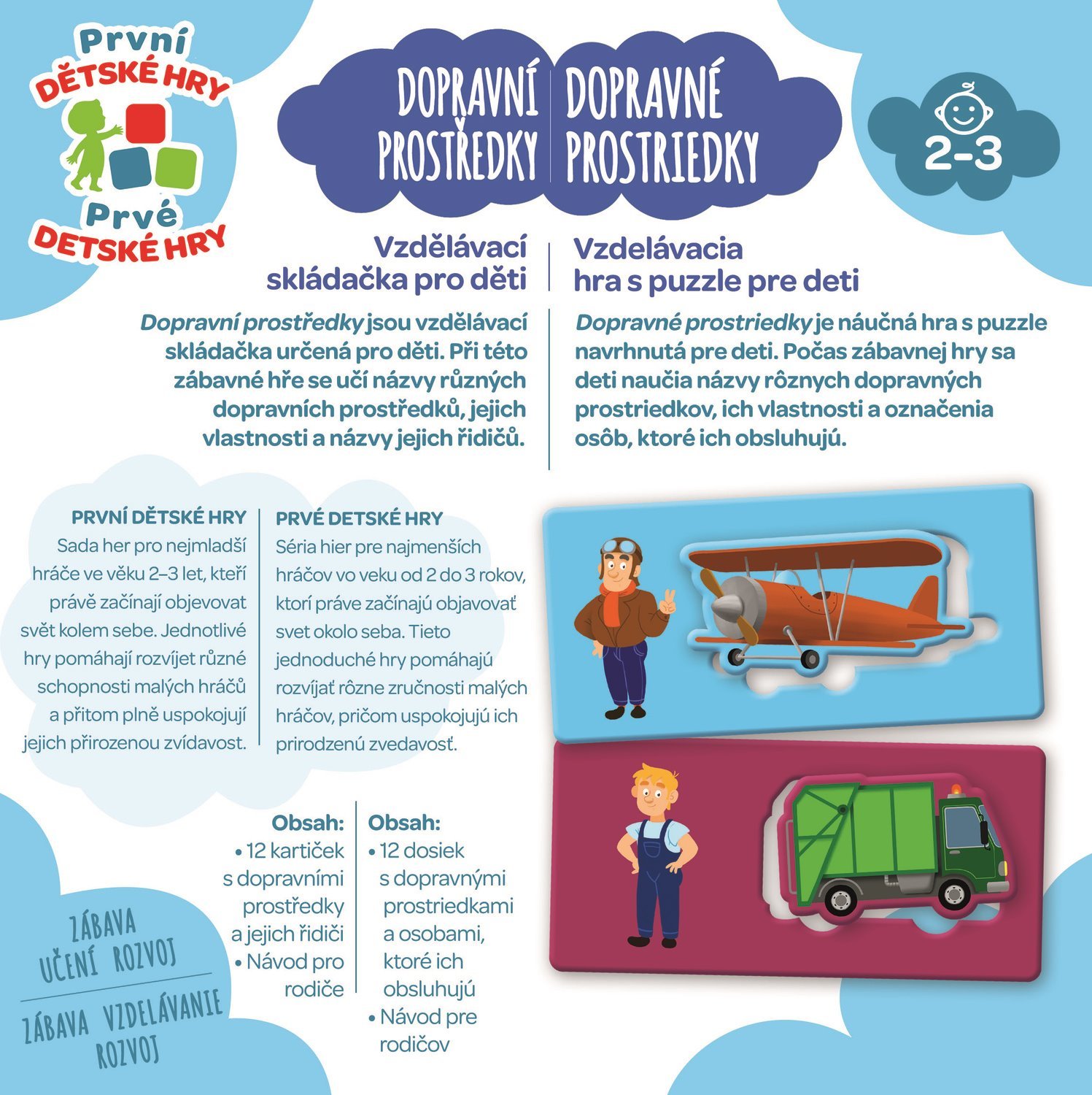 Vzdelávacia skladačka pre deti. Dopravné prostriedky sú vzdelávacia skladačka určená pre deti. Pri tejto zábavnej hre sa učia názvy rôznych dopravných prostriedkov, ich vlastnosti a názvy ich vodičov. zoznamovanie sa dopravnými prostriedkami jednoduché pravidlá pestrofarebné obrázky vyrobené zo silného kartónu veľké dieliky pre ľahké uchopenie Hra obsahuje: 12 kartičiek s dopravnými prostriedkami a ich vodičmi a návod pre rodičov. Prvé detské hry Sada hier pre najmladších hráčov vo veku 2-3 rokov, ktorí začínajú objavovať svet okolo seba. Jednotlivé hry pomáhajú rozvíjať rôzne schopnosti malých hráčov a pritom plne uspokojujú ich prirodzenú zvedavosť.Vlastnosti