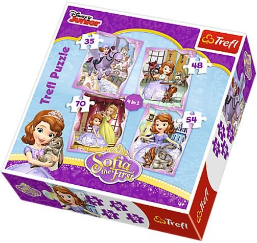 Detské puzzle TREFL so štyrmi obrázkami Princezné Sofie Prvý. Progresívny puzzle s rôznou obtiažnosťou - 4 puzzle s 35, 48, 54 a 70 dieliky. Doporučené pre deti od 4 rokov. Rozmer zloženého puzzle 20,5 x 28,5 cm