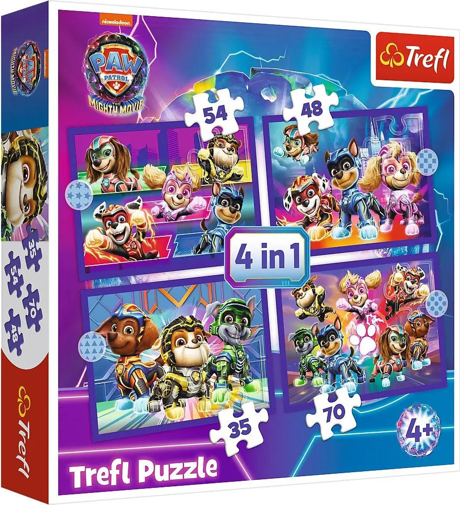 Detské puzzle TREFL s motívom animovaného filmu Tlapková patrola. Progresívne puzzle s rôznou obtiažnosťou - 4 puzzle s 35 - 70 dielikmi. Rozmer zloženého puzzle cca 28,5 x 20,5 cmVlastnosti