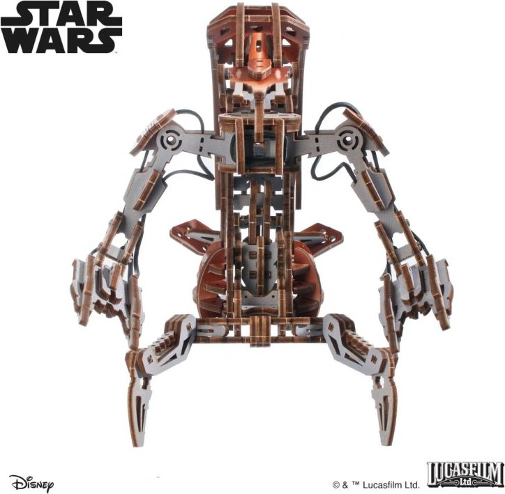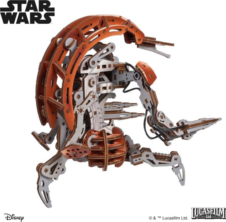Postavte si vlastnú legendárnu Droideku, ikonického ničivého bojového droida zo sveta Star Wars™ v podobe 3D dreveného mechanického puzzle od Ugears. Tento model prináša autentický zážitok z konštrukcie aj hrania vďaka prepracovanému mechanizmu, ktorý umožňuje zložiť model do kompaktnej gule a potom ho ručne rozvinúť do bojovej polohy, rovnako ako vo filme. Model má 180 precízne vyrezaných dielov, ktoré do seba zapadajú bez nutnosti lepenia alebo použitia špeciálnych nástrojov, a prinášajú tak zábavnú aj technicky zaujímavú výzvu pre všetkých fanúšikov mechanických modelov a Star Wars™ zberateľov. Súčasťou modelu sú aj dva aktívne spôsoby spustenia jeho rozvinutia. Buď ho jednoducho zdvihnite nad stôl a nechajte ho „vyskočiť“ do bojovej polohy, alebo uzamknite mechanizmus na jeden či dva zámky a rozbehnite ho pre efektívnejšiu aktiváciu.