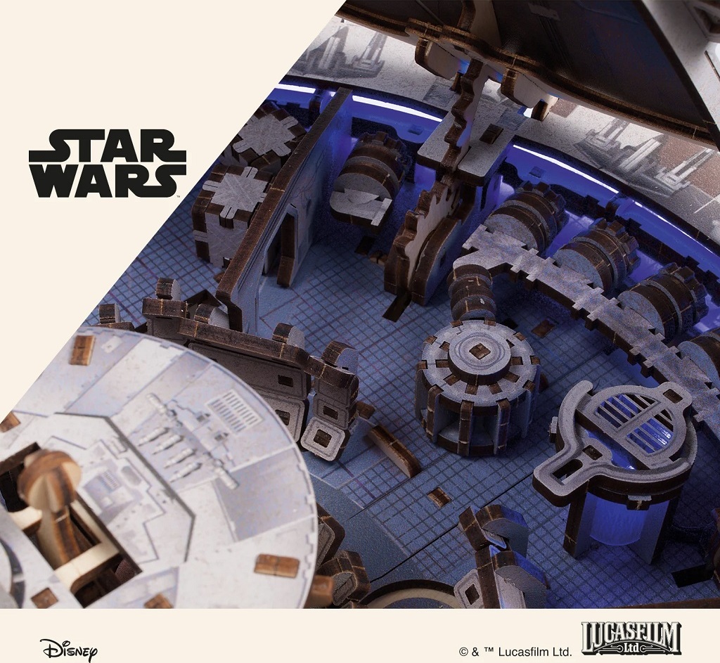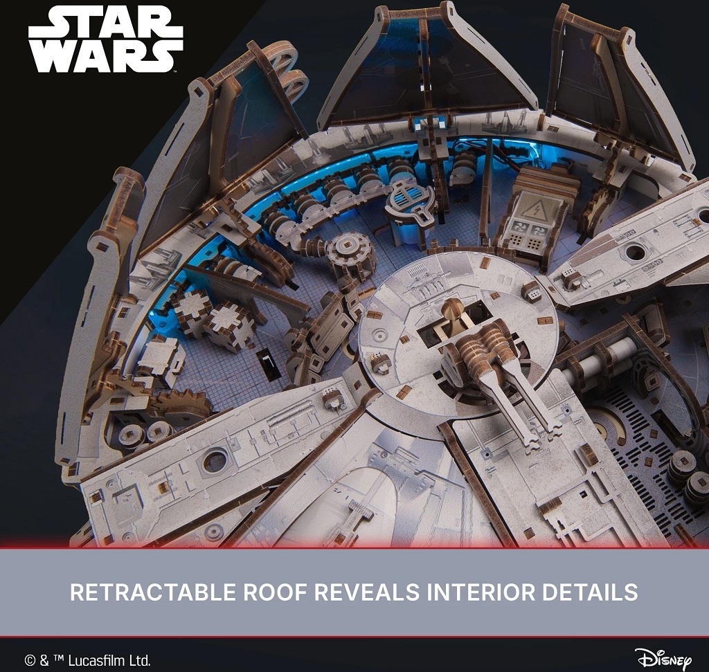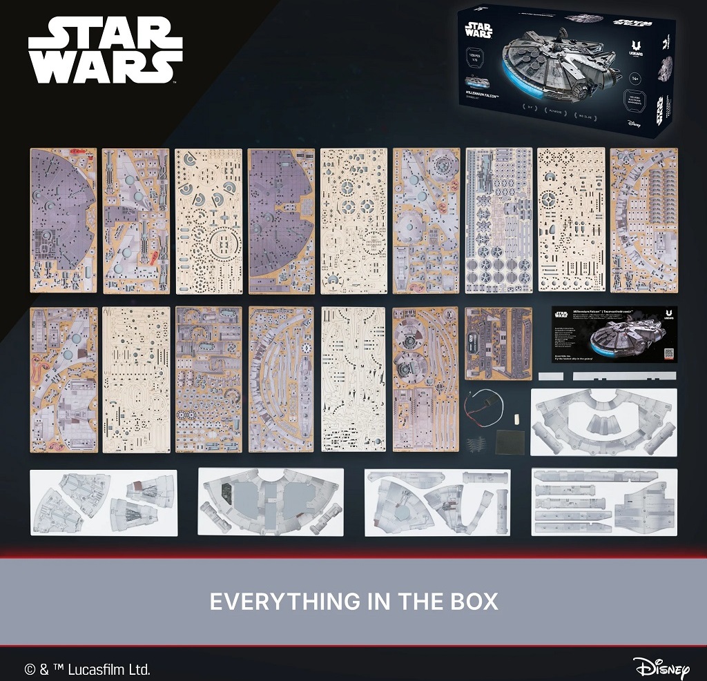 Postavte si legendárnu loď Millennium Falcon, v ktorej lietal Han Solo a jeho posádka. Má modré LED svetlá ako hyperpohon, otváraciu strechu, nákladový priestor a rampu, pohyblivé delostrelecké veže a anténu otočnú o 360 °. Nechýbajú ani prepracované detaily interiéru a exteriéru. Poskladajte a pilotujte najrýchlejšiu loď v galaxii! Preleťte Kessel Run za menej ako dvanásť parsekov s touto skladačkou z Ugears oficiálnej kolekcie Star Wars. Model milovanej lode Hana Sola a Chewbaccy v mierke 1: 75 je jedným z najdetailnejších modelov. Millennium Falcon, kľúčová stíhačka v najzásadnejších bitkách proti Galaktickému impériu, prešla rukami mnohých zločincov, než bola nakoniec ukradnutá a pilotovaná Rey vo filme Sila sa prebúdza (2015), kým ju Han a Chewie získali po toľkých rokoch konečne späť do svojich rúk. loď, ktorú poznajú všetci fanúšikovia z filmov Star Wars. Hyperpohon simulujú modré LED svetlá, ktoré sú napájané batériami, tie však nie sú súčasťou balenia. Medzi pohyblivé prvky patria dvere nákladového priestoru, rampa, podvozok, delostrelecké veže, anténa otočná o 360 ° a zaťahovacia strecha, ktorá sa otvára na časti a umožňuje zobraziť naozaj detailný a realistický interiér lode. Drevovláknitá doska s vysokou hustotou a kartón dodávajú lodi väčšiu odolnosť a zaujímavý vzhľad. Postavte si kus filmovej histórie, postavte si impozantný 3D model lode Millennium Falcon.