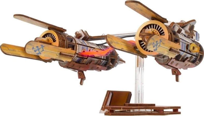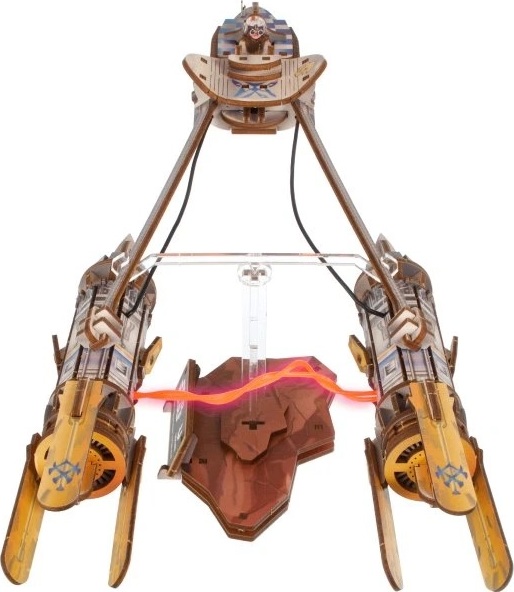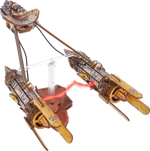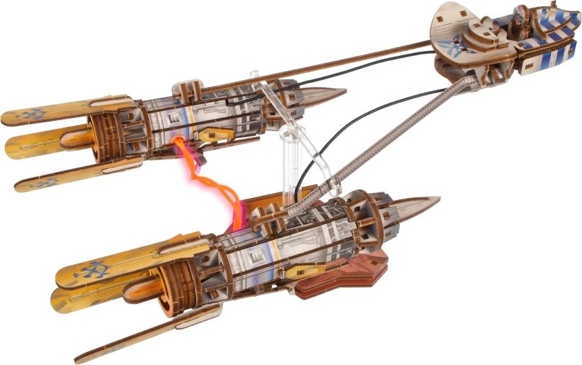 Postavte si svoj vlastný klzák a pretekajte rovnako ako Anakin Skywalker! Drevený model sa hojdá do strán, nechýbajú ani dva detailné motory, ktoré sú spojené plazmovým oblúkom. Dokážete vyhrať preteky Boonta Eve Classic rovnako ako Anakin vo filme Skrytá hrozba? Dvojité motory prepája svietiaci LED plazmový oblúk, za nimi sa nachádza malý kokpit. Tento ikonický klzák mladému Anakinovi pomohol získať slobodu na domovskej piesočnej planéte Tatootine. Sám si ho nadesignoval aj postavil, toto obľúbené vznášadlo v sebe spája rýdzu silu, nebojácne pilotovanie a súťaživého ducha budúceho Jediho. Skladačka je postavená na akrylovej nohe, ktorá ju pohybuje zo strany na stranu, simuluje tak let klzáku! Anakin Skywalker sedí vo vnútri detailného kokpitu, ktorého bočné dvere je možné otvoriť. Dva motory sú prepojené flexibilnými LED vodičmi napájanými batériami, tie však nie sú súčasťou balenia. Vytvárajú charakteristický efekt plazmového oblúka, rovnako ako vo filme. Pre aktiváciu svetiel jednoducho prepnite spínač umiestnený pod motormi a sledujte, ako sa oblúk prebúdza k životu. Pokiaľ sa batéria vybije, žiadny problém, výmena je naozaj jednoduchá. Model je vyrobený z kvalitnej farebnej preglejky tak, aby naozaj dokázal balansovať. Pridáte ho do svojej Star Wars zbierky?