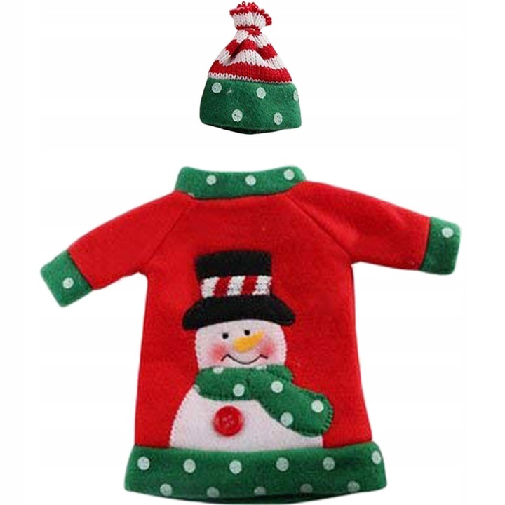 Sada obsahuje 1 červený sveter s motívom snehuliaka a 1 červeno / biela čiapka so zeleným lemom.