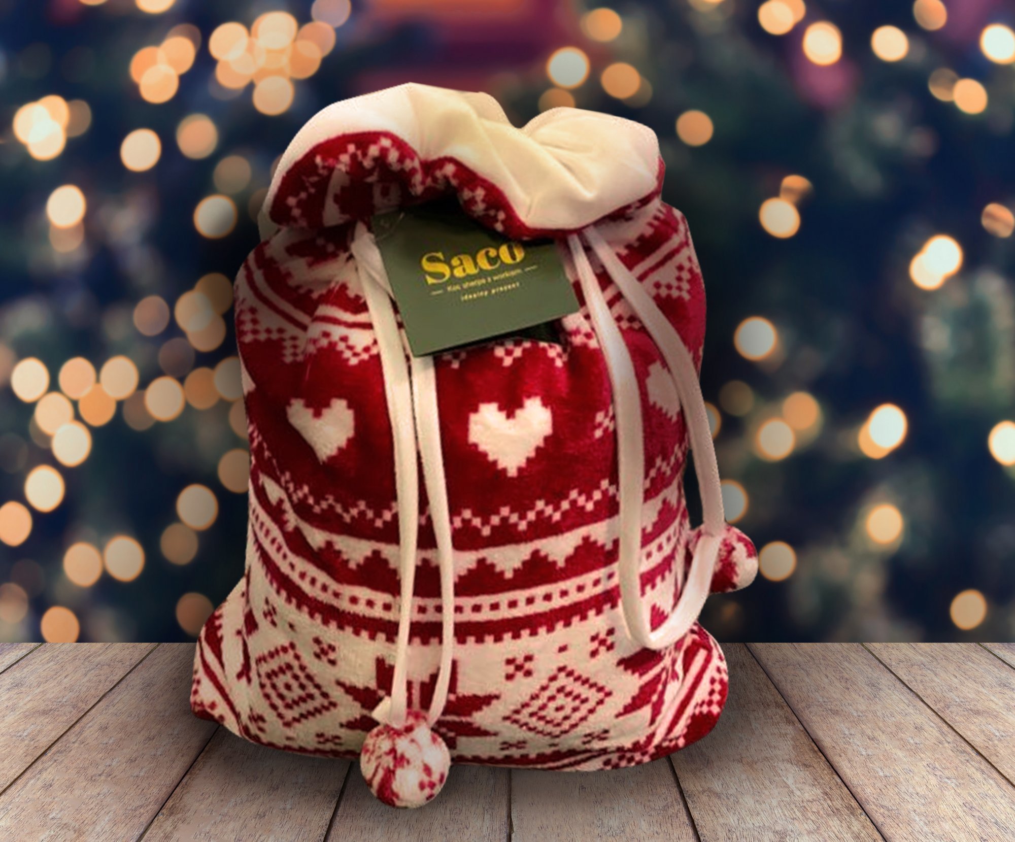 Vianočná deka z kolekcie Saco je skvelým nápadom na darček a ideálna na zdobenie vášho domova počas zimného a vianočného obdobia. Deka je vyrobená z polyesterovej tkaniny, ktorá sa ľahko čistí. Tento materiál je mäkký, teplý a praktický. Deka má zvonku sviatočný škandinávsky vzor a zvnútra je podšitá jednofarebnou bielou šerpa látkou, ktorá je hrejivá ako vlna. Táto jemná látka sa vyznačuje hypoalergénnym zložením. Celá sada je zabalená v štýlovom sáčku, ktorý ladí s dekou farbou aj vzorom. Táto sada je ideálnym darčekom.