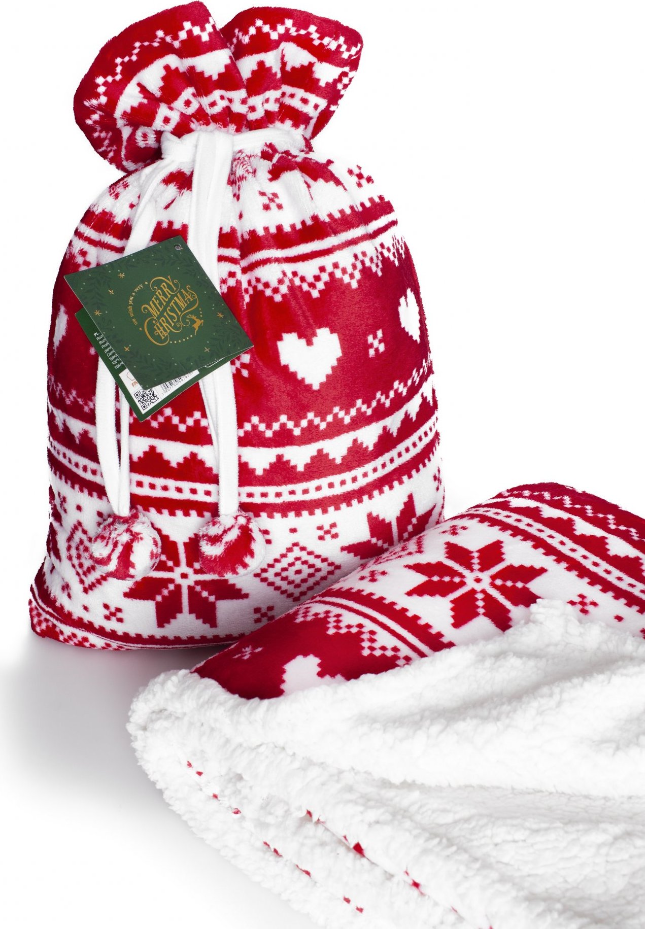 Vianočná deka z kolekcie Saco je skvelým nápadom na darček a ideálna na zdobenie vášho domova počas zimného a vianočného obdobia. Deka je vyrobená z polyesterovej tkaniny, ktorá sa ľahko čistí. Tento materiál je mäkký, teplý a praktický. Deka má zvonku sviatočný škandinávsky vzor a zvnútra je podšitá jednofarebnou bielou šerpa látkou, ktorá je hrejivá ako vlna. Táto jemná látka sa vyznačuje hypoalergénnym zložením. Celá sada je zabalená v štýlovom sáčku, ktorý ladí s dekou farbou aj vzorom. Táto sada je ideálnym darčekom.