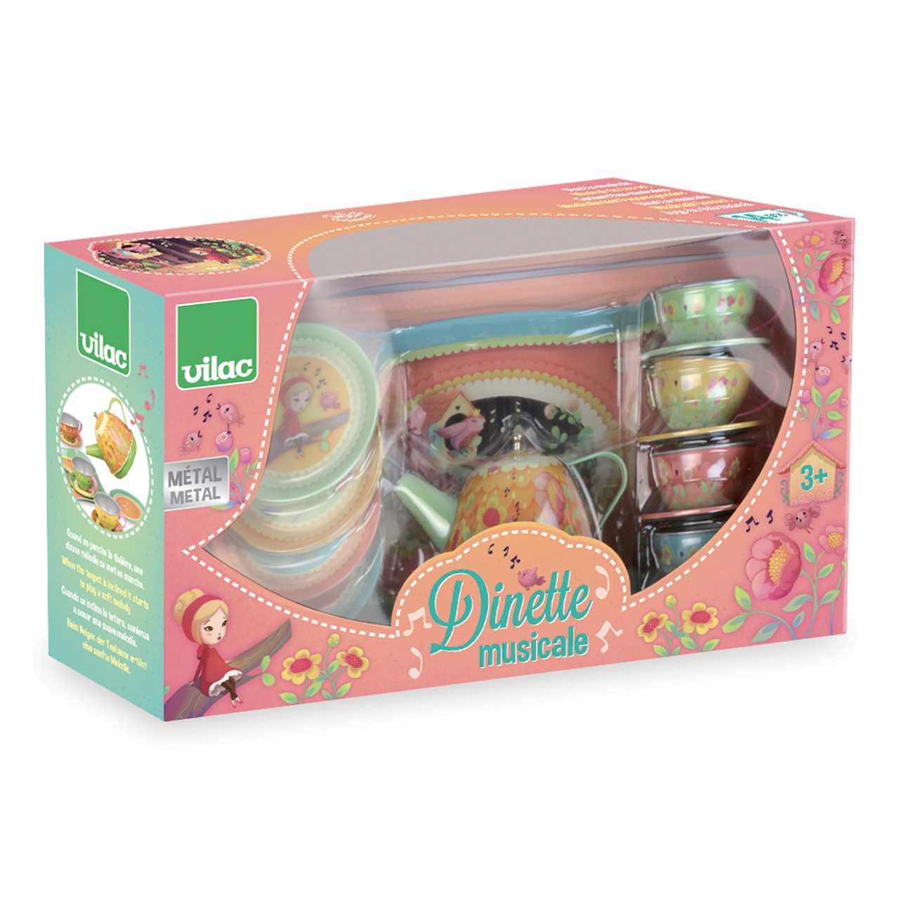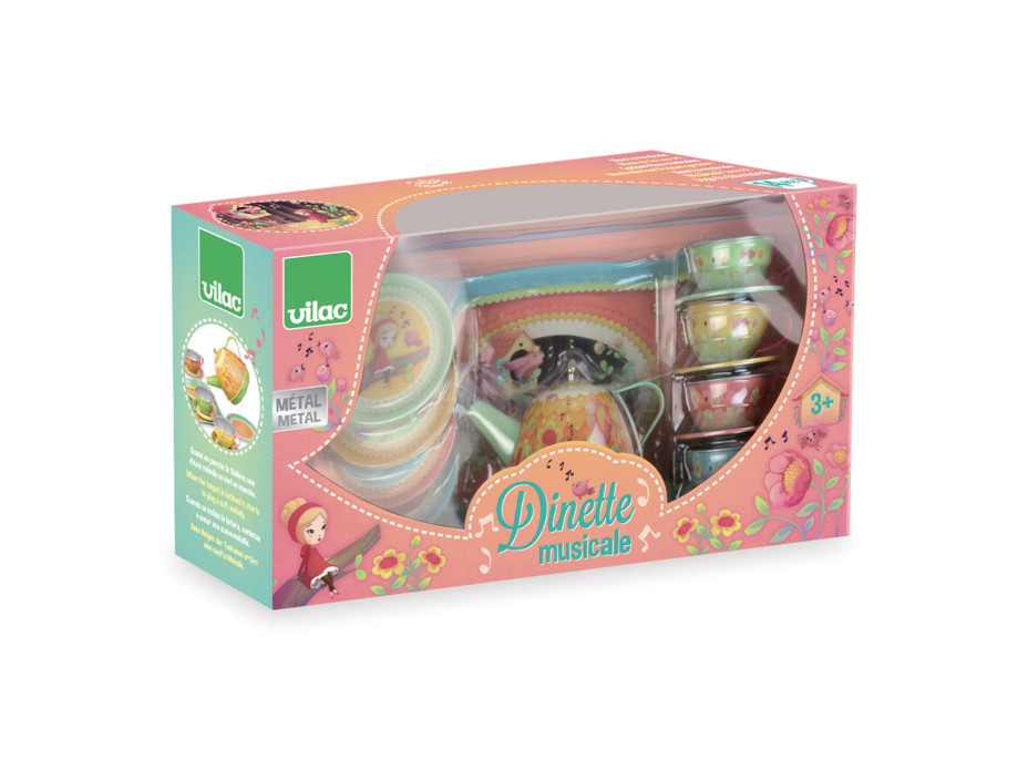 Kovový set riadu s krásnou rozprávkovou ilustráciou „magického lesu“, s podtáckom. Tento set je špeciálny v tom, že pri servírovaní hrá hudbu. V balení nájdete 14 ks vybavenia: veľká tácka pre ľahký presun riadu, 4 hrnčeky s podtácky, 4 dezertné tanieriky a kanvičku, ktorá pri náklone začne hrať peknú melódiu. Veľkosť tak akurát pre detské ruky. Vyrobené vo Francúzsku.