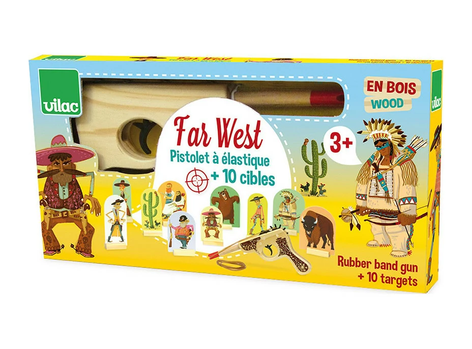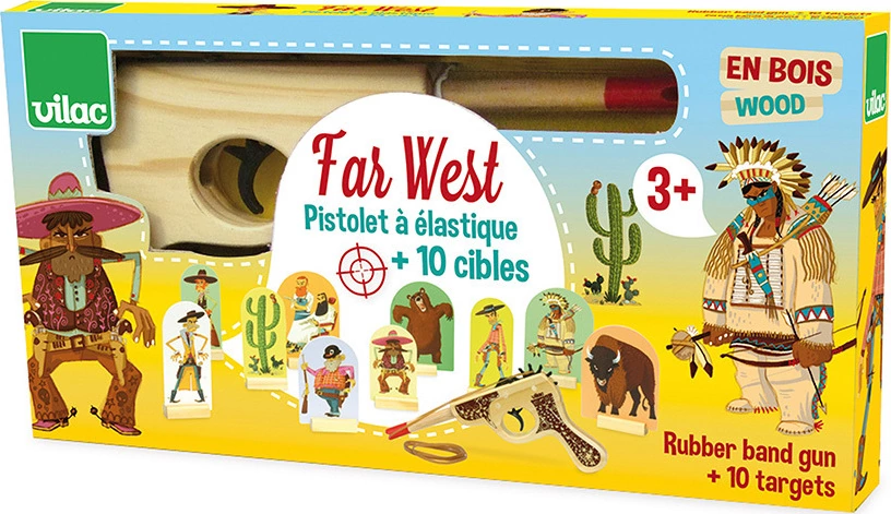 Divoký západ! Westernová hra, v ktorej vyhráva ten, kto zostrelí najviac cieľov. Jednoducho natiahnite gumičku na drevenú pištoľku, postavte terče a môžete začať strieľať.