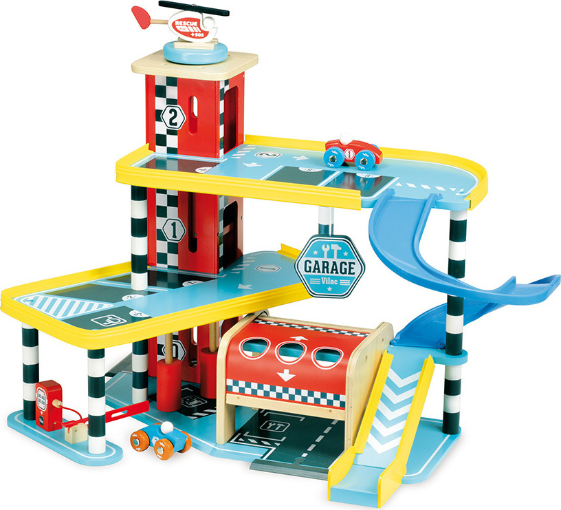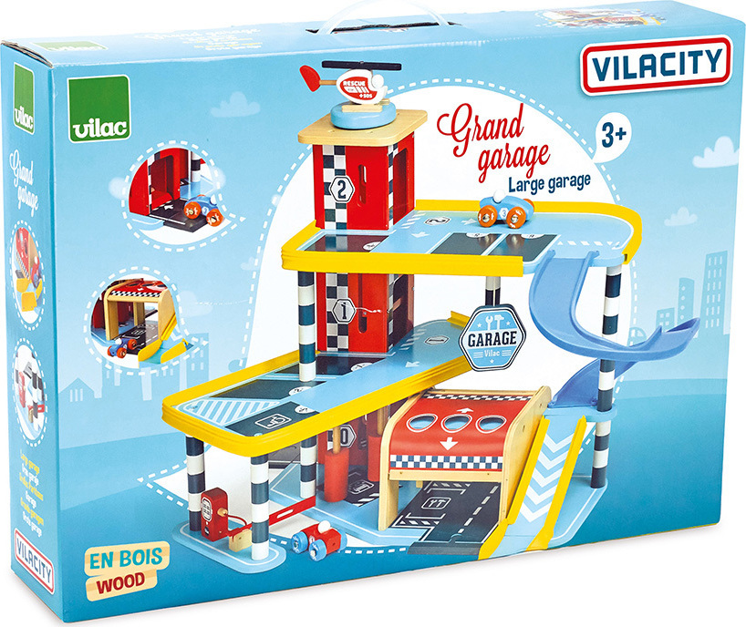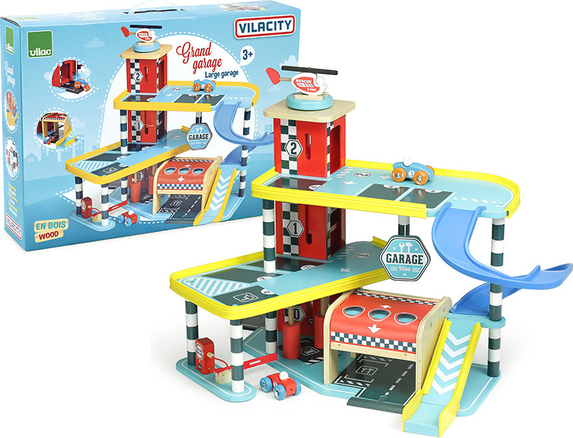Veľká garáž s rampou, ktorá ponúka množstvo mechanických detailov, najmä výťah, zaťahovacie dvere, parkovaciu závoru, ale aj čerpací stojan, či umývacie kefy. Jej súčasťou je aj dvojica autíčok a helikoptéra. Garáž je súčasťou Vilacity kolekcie a je so všetkými jej súčasťami plne kompatibilná, ďalšie samostatné rozšírenia prinesú variabilitu a prehĺbia zážitok z hry. Výrobok vyžaduje montáž, dodávané s detailným návodom na zostavenie.