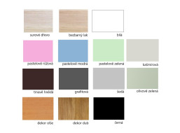NOVINKA: Vybrané postele z masívu dodávame v prírodnej farbe (ošetrené bezfarebným ekologickým lakom), morené v odtieňoch jelša či dub, v povrchovej úprave biela, ružová, zelená či modrá farba alebo v surovom stave bez povrchovej úpravy. Vzorkovník možných povrchových úprav detských postelí z masívu nájdete v detailoch príslušného produktu.