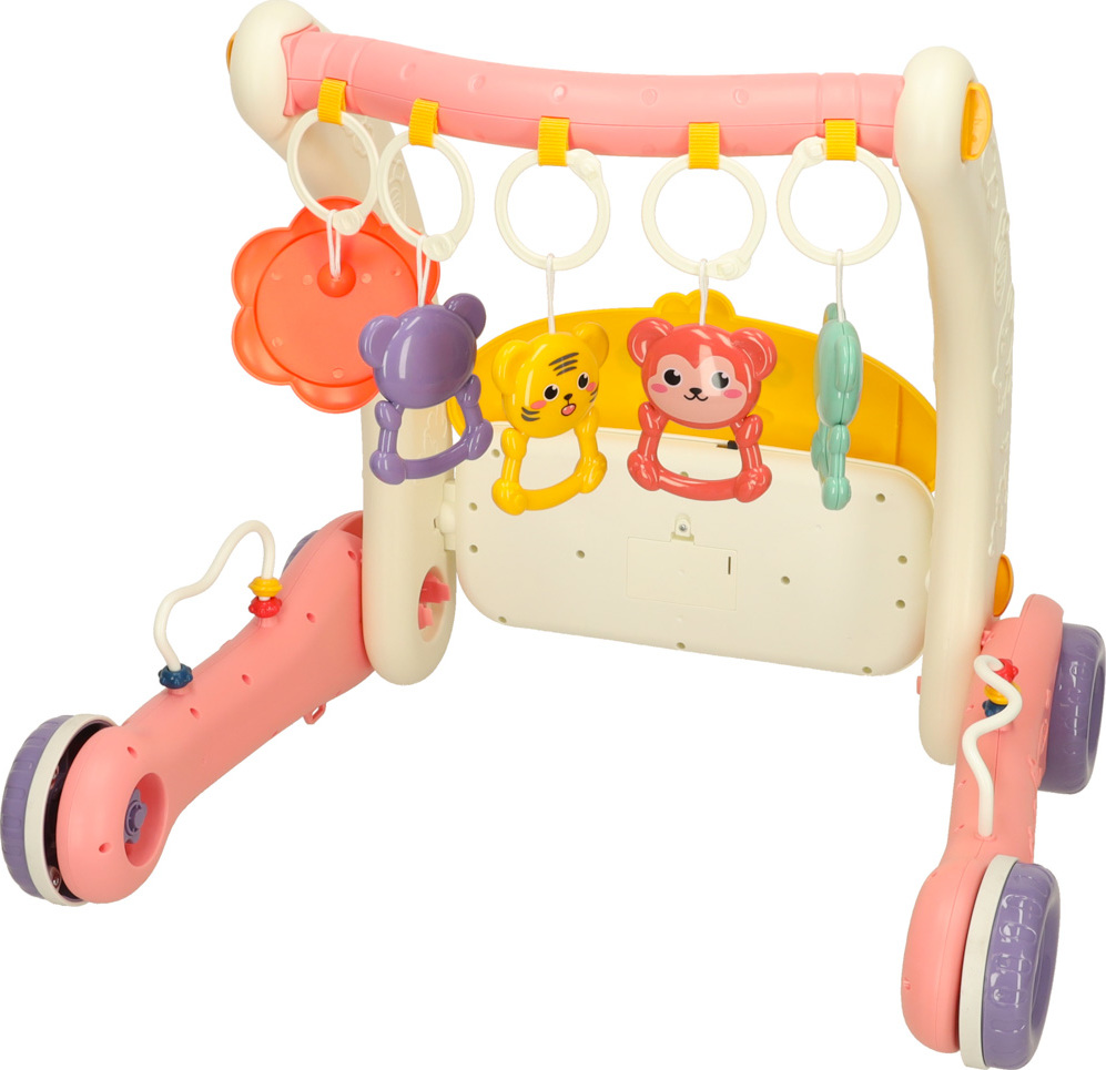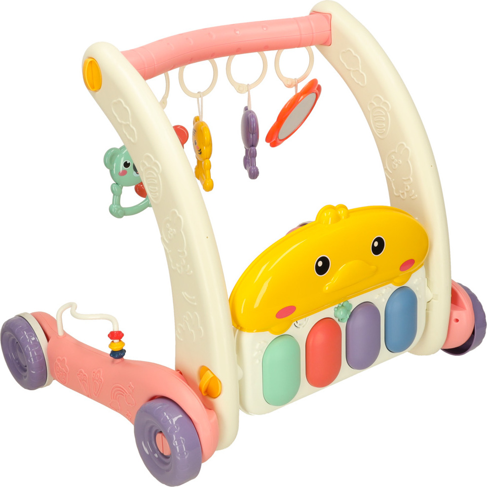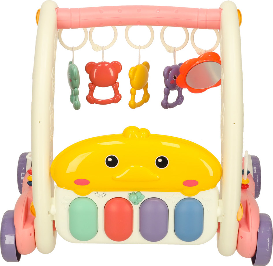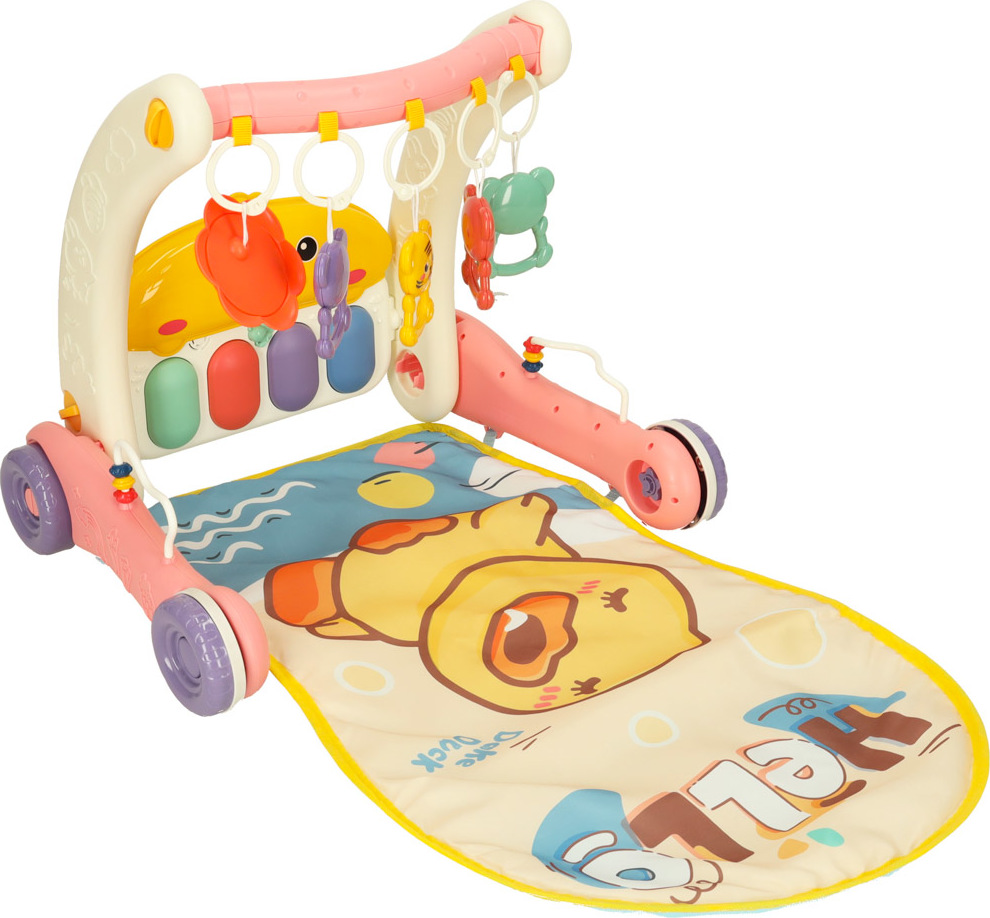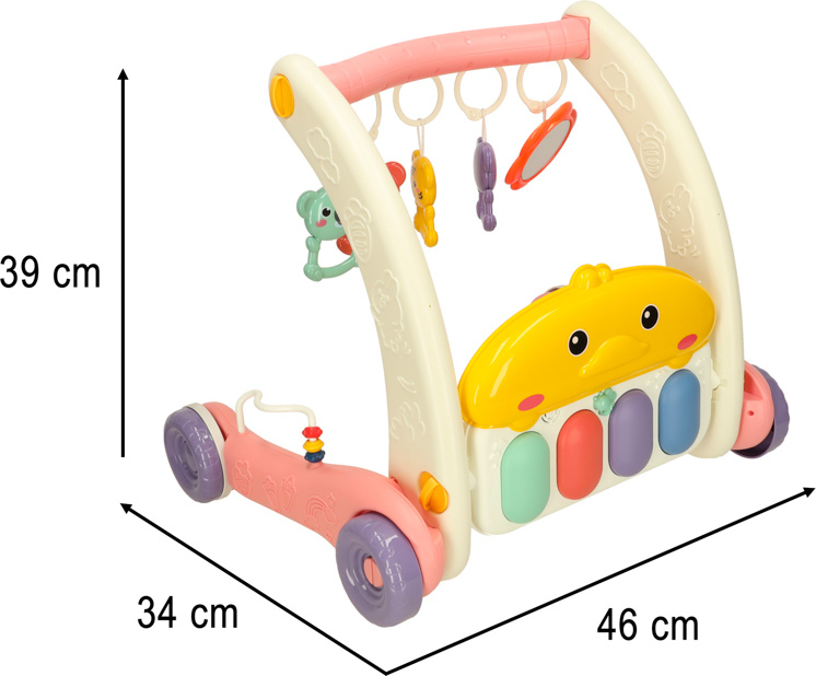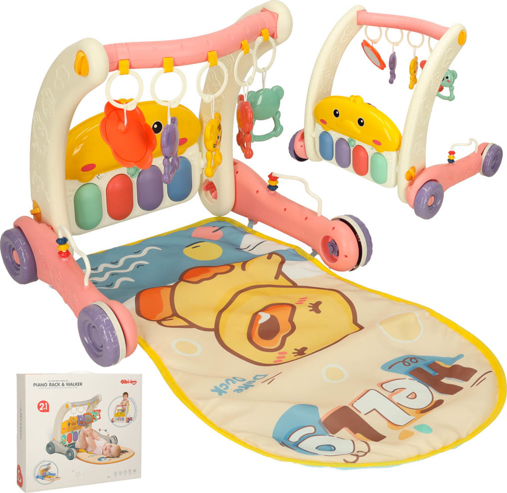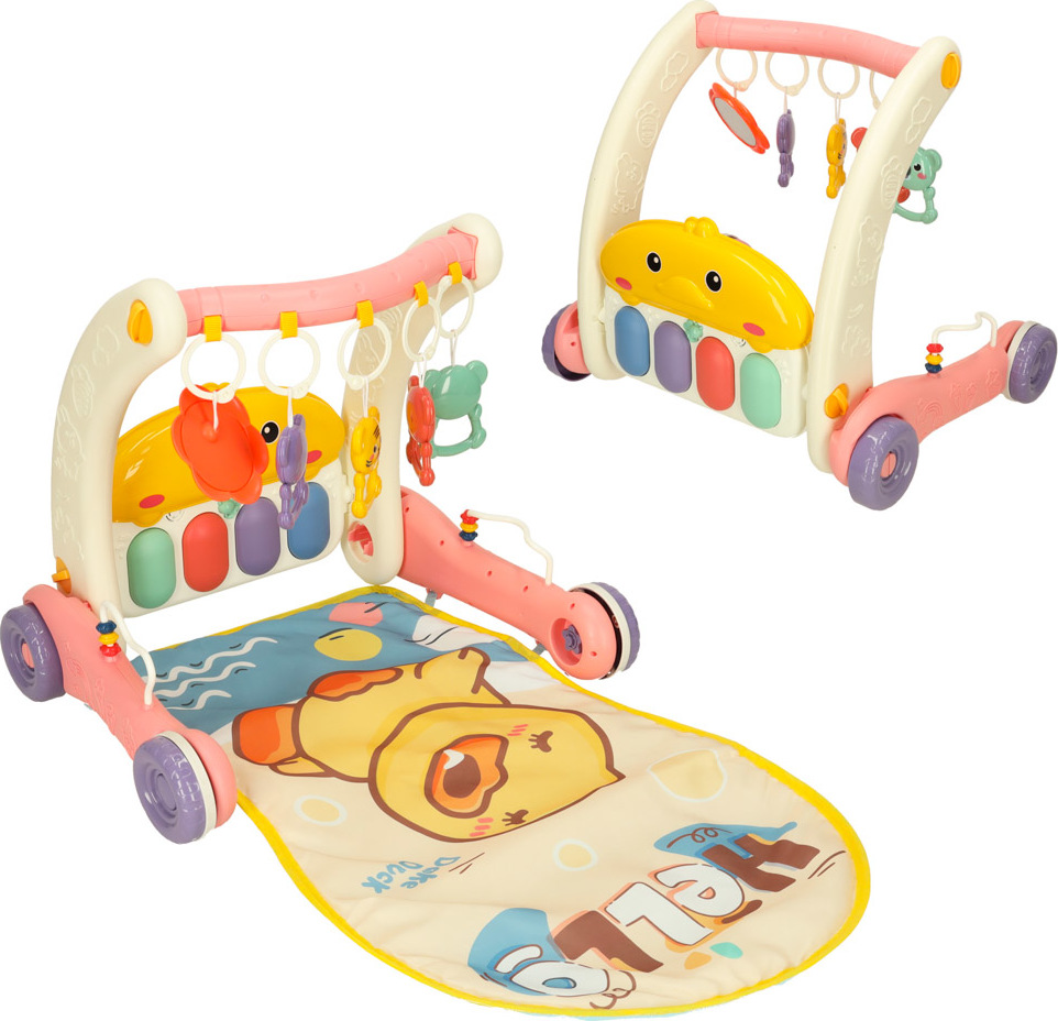 Ide o jedinečné zábavné centrum pre vaše dieťa. Kombinuje funkcie hracej podložky a stabilného chodítka, ktoré podporuje prvé krôčiky vášho dieťaťa. Výrobok rastie spolu s vašim dieťaťom. Na začiatku, keď dieťa leží na brušku, sa môže hrať s farebnými príveskami a počúvať zvuky klavíra. Až príde čas na prvé krôčiky, jednoducho premeňte podložku na stabilné chodítko, ktoré zaistí bezpečie a istotu pri učení chôdze. Pianinko s dvoma prevádzkovými režimami a ovládaním hlasitosti zabaví na dlhé hodiny. Príjemné melódie a zvuky stimulujú zmysly dieťaťa a rozvíjajú jeho sluch. Farebné prívesky stimulujú hmat a zrak a rozvíjajú koordináciu ruka-oko. Ružové chodítko podporuje motorický, kognitívny a zmyslový vývoj dieťaťa. Pravidelnou hrou si batoľa precvičuje motorickú koordináciu a rozvíja svoju zvedavosť voči svetu.
