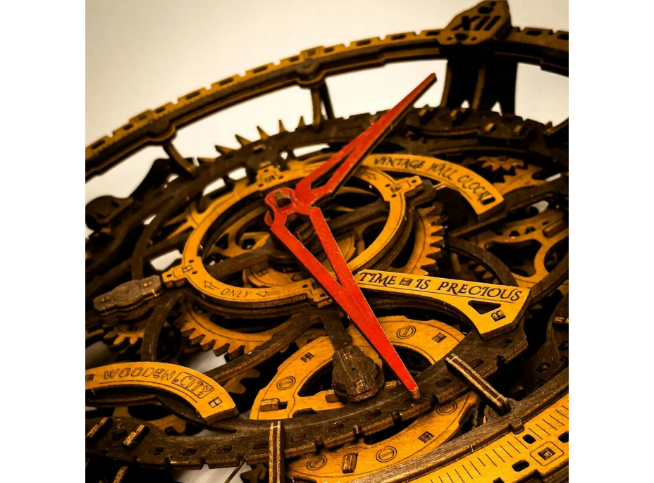3D puzzle sada na vytvorenie úchvatných funkčných industriálnych hodín s kyvadlom, ktoré sa budú krásne vynímať na stene. Zostavte všetky diely a mechanizmy dohromady a sledujte, ako fungujú. A keď budete hotoví, veda a umenie splynú v jedinečné dekoračné dielo. Nástenné hodiny WOODEN CITY sú neobvyklým darčekom pre milovníkov krásy a prekvapenia. Presnosť hodinového strojčeka je možné nastaviť pomocou olovnice. Doba prevádzky po natiahnutí je až 12 hodín. Orientačná doba na zloženie: 6 hodín. Drevené 3D puzzle WOODEN CITY sú detailne prepracované funkčné mechanické modely, ktoré sa skladajú bez lepidla alebo náradia. Sú vyrobené z ekologických drevených materiálov - kvalitné brezové preglejky. S mechanickými drevenými puzzle WOODEN CITY zažijete hodiny zábavy pri skladaní a spoznáte prevody, gumičkové motory, ozubené kolieska a ďalšie súčiastky z bezprostrednej blízkosti.