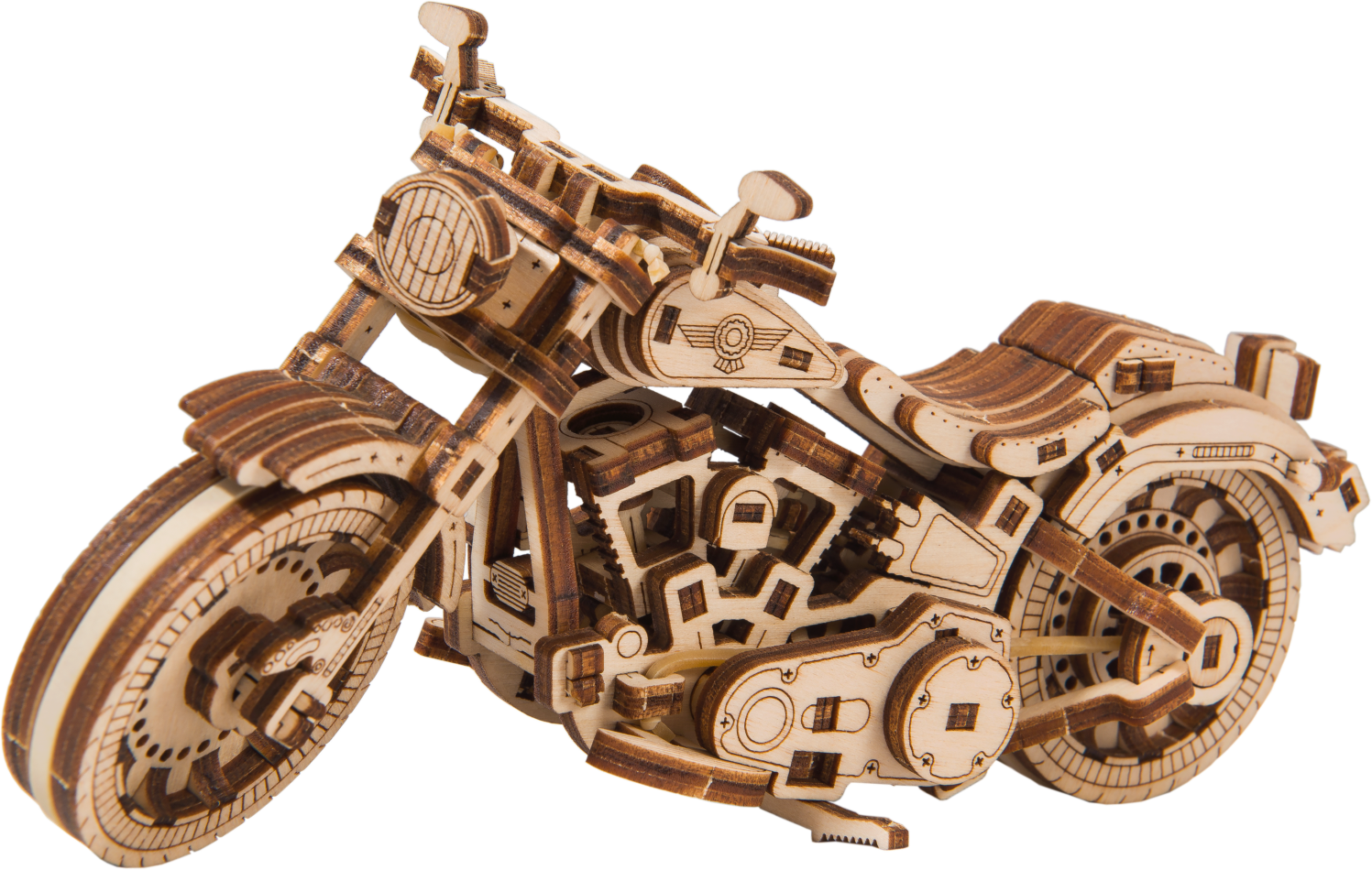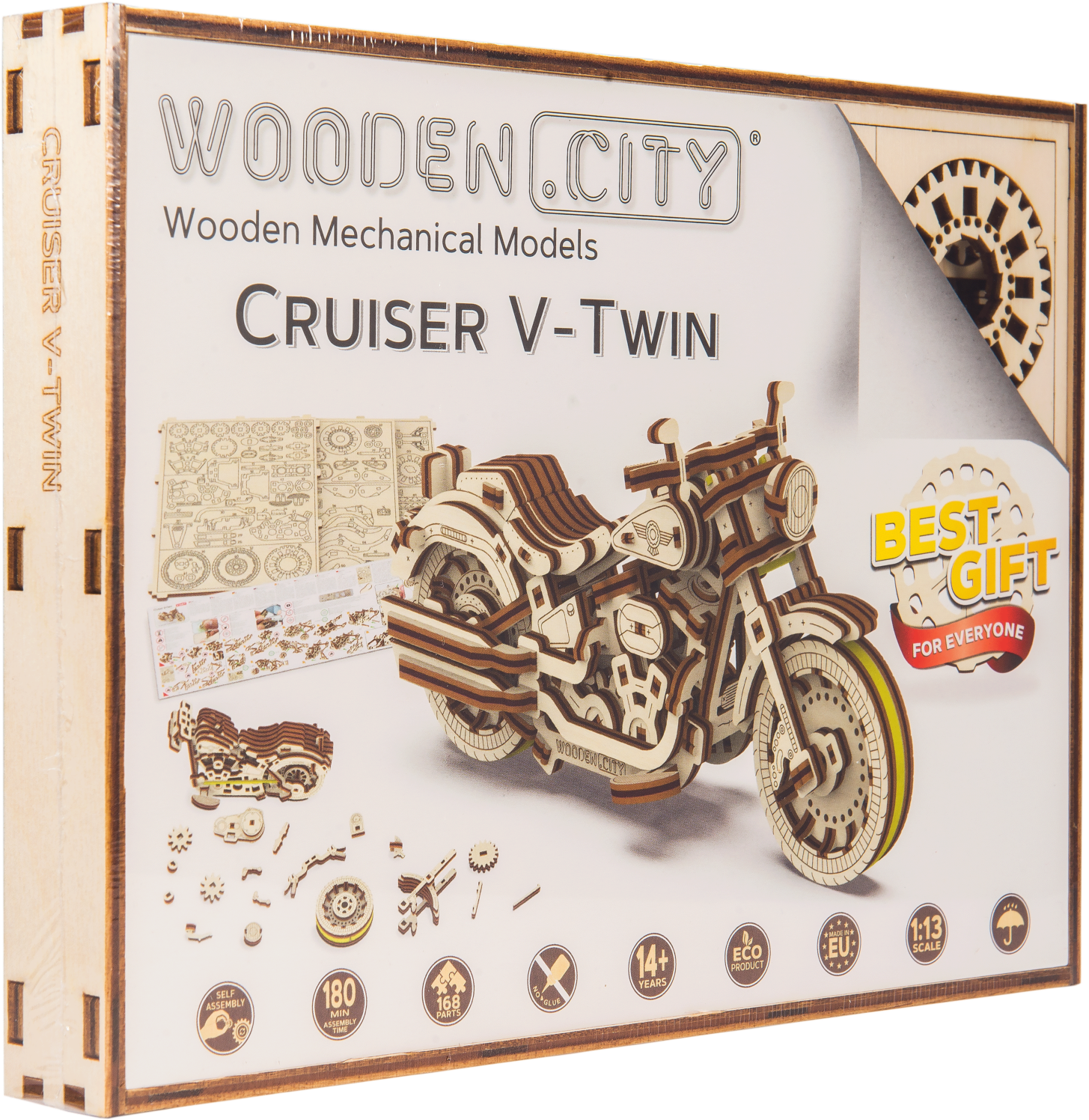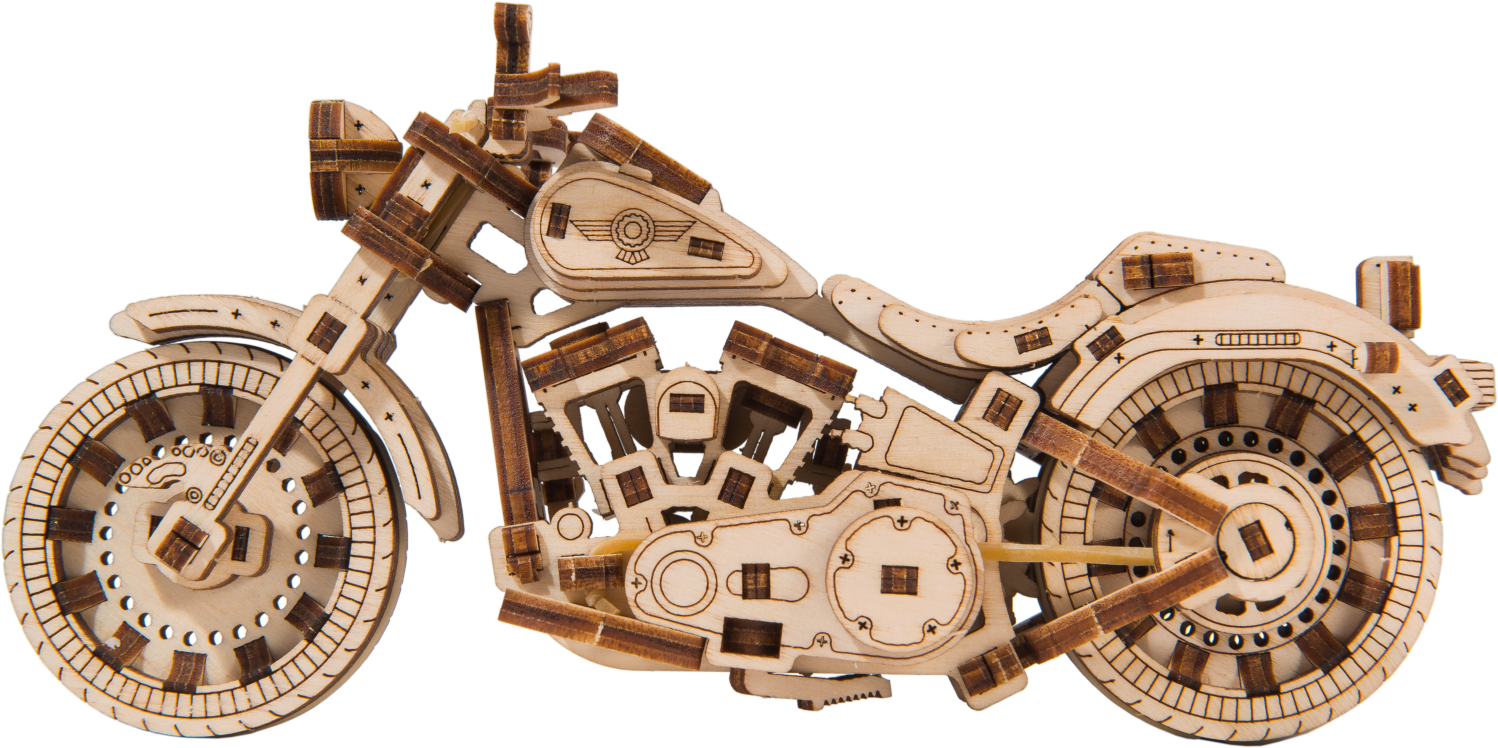 Drevená mechanická stavebnica najúžasnejšie motorky Cruiser V-Twin na vás čaká! Vďaka jedinečnému dizajnu a prekvapivým detailom tohto modelu bude vaše trávenie času plné zábavy a skvelých emócií. Môžete používať riadenie pomocou predného kolesa. Motorka so zotrvačným mechanizmom môže prejsť až 1 meter. Nadchnú vás pohyblivé valce pri otáčaní zadného kolesa a tiež tlmiče na prednej vidlici motorky. Cruiser V-Twin je vybavený brzdovými kotúčmi a pogumovanými kolesami. V modeli sú zastúpené detaily skutočného motocykla: - funkčný stojan, - smerové svetlo, - registračná značka, - odrazové sklá, - spätné zrkadlá. 3D puzzle WOODEN CITY Cruiser V-twin bude najlepším darčekom pre každého milovníka motocyklov. Obtiažnosť: 3 z 5 (podľa rozdelenia Wooden City) Orientačná doba na zloženie: 2 hodiny Mierka: 1:13 Drevené 3D puzzle WOODEN CITY sú detailne prepracované funkčné mechanické modely, ktoré sa skladajú bez lepidla alebo náradia. Sú vyrobené z ekologických drevených materiálov - kvalitné brezové preglejky. S mechanickými drevenými puzzle WOODEN CITY zažijete hodiny zábavy pri skladaní a spoznáte prevody, gumičkové motory, ozubené kolieska a ďalšie súčiastky z bezprostrednej blízkosti. funkčný mechanický model skladania bez použitia lepidla alebo náradia kvalitné spracovanie z prírodného materiálu prepracované detaily UPOZORNENIE: Na zostavenie je potrebné ulamovací nôž, nožnice, brúsny papier a sviečku z vosku (nie je súčasťou výrobku). Pre správne fungovanie a bezproblémovú prevádzku je potrebné nápravy a ozubené kolieska navoskovať. Rozmer zloženého puzzle cca 18 x 8,6 x 6 cmVlastnosti