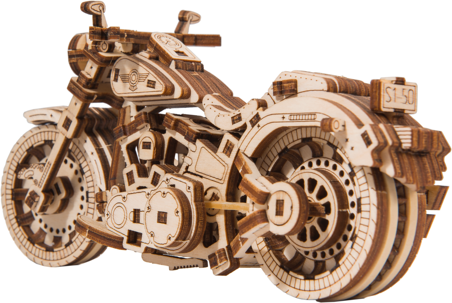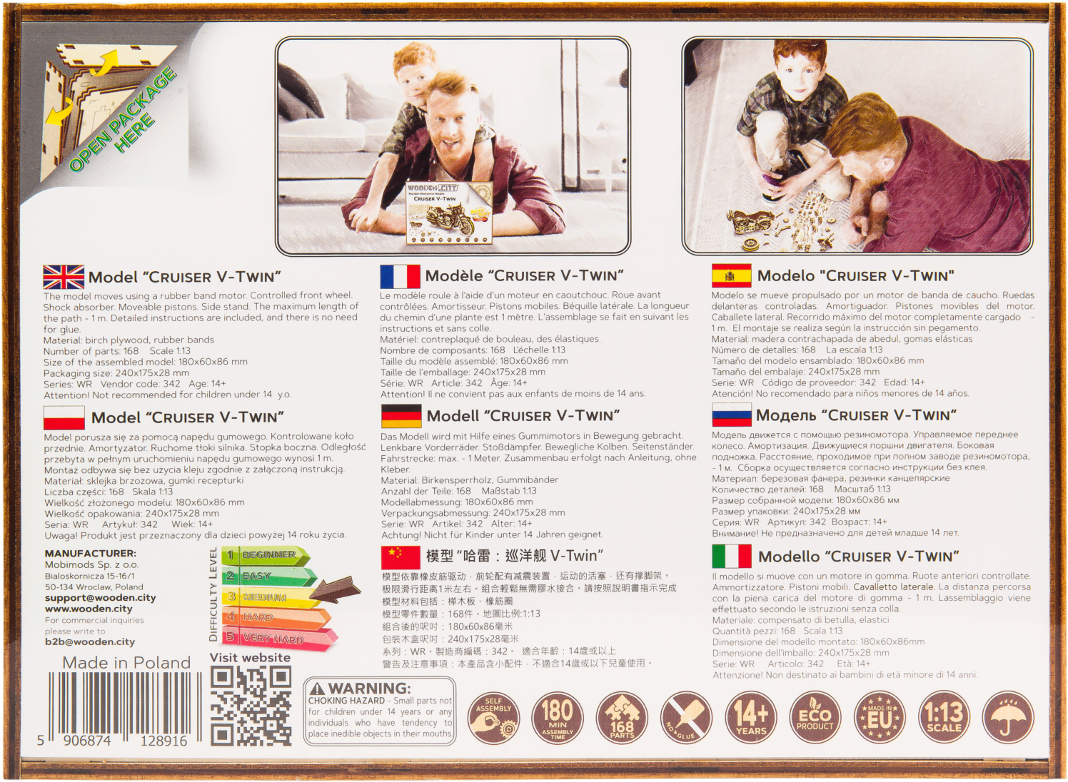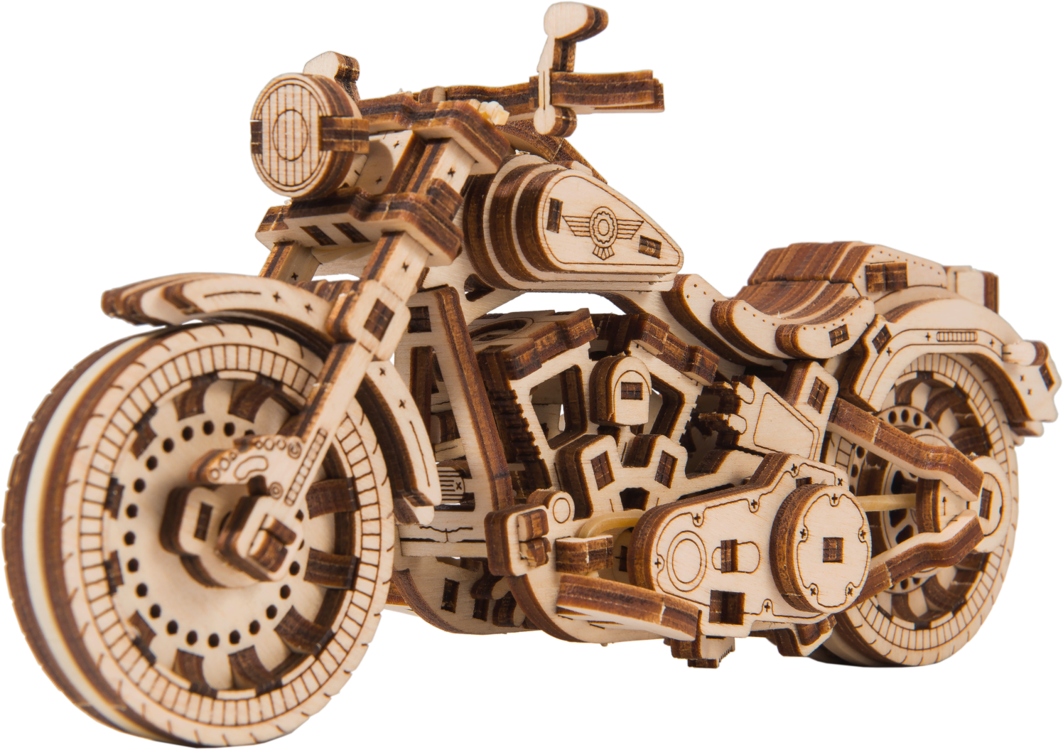 Drevená mechanická stavebnica najúžasnejšie motorky Cruiser V-Twin na vás čaká! Vďaka jedinečnému dizajnu a prekvapivým detailom tohto modelu bude vaše trávenie času plné zábavy a skvelých emócií. Môžete používať riadenie pomocou predného kolesa. Motorka so zotrvačným mechanizmom môže prejsť až 1 meter. Nadchnú vás pohyblivé valce pri otáčaní zadného kolesa a tiež tlmiče na prednej vidlici motorky. Cruiser V-Twin je vybavený brzdovými kotúčmi a pogumovanými kolesami. V modeli sú zastúpené detaily skutočného motocykla: - funkčný stojan, - smerové svetlo, - registračná značka, - odrazové sklá, - spätné zrkadlá. 3D puzzle WOODEN CITY Cruiser V-twin bude najlepším darčekom pre každého milovníka motocyklov. Obtiažnosť: 3 z 5 (podľa rozdelenia Wooden City) Orientačná doba na zloženie: 2 hodiny Mierka: 1:13 Drevené 3D puzzle WOODEN CITY sú detailne prepracované funkčné mechanické modely, ktoré sa skladajú bez lepidla alebo náradia. Sú vyrobené z ekologických drevených materiálov - kvalitné brezové preglejky. S mechanickými drevenými puzzle WOODEN CITY zažijete hodiny zábavy pri skladaní a spoznáte prevody, gumičkové motory, ozubené kolieska a ďalšie súčiastky z bezprostrednej blízkosti. funkčný mechanický model skladania bez použitia lepidla alebo náradia kvalitné spracovanie z prírodného materiálu prepracované detaily UPOZORNENIE: Na zostavenie je potrebné ulamovací nôž, nožnice, brúsny papier a sviečku z vosku (nie je súčasťou výrobku). Pre správne fungovanie a bezproblémovú prevádzku je potrebné nápravy a ozubené kolieska navoskovať. Rozmer zloženého puzzle cca 18 x 8,6 x 6 cmVlastnosti