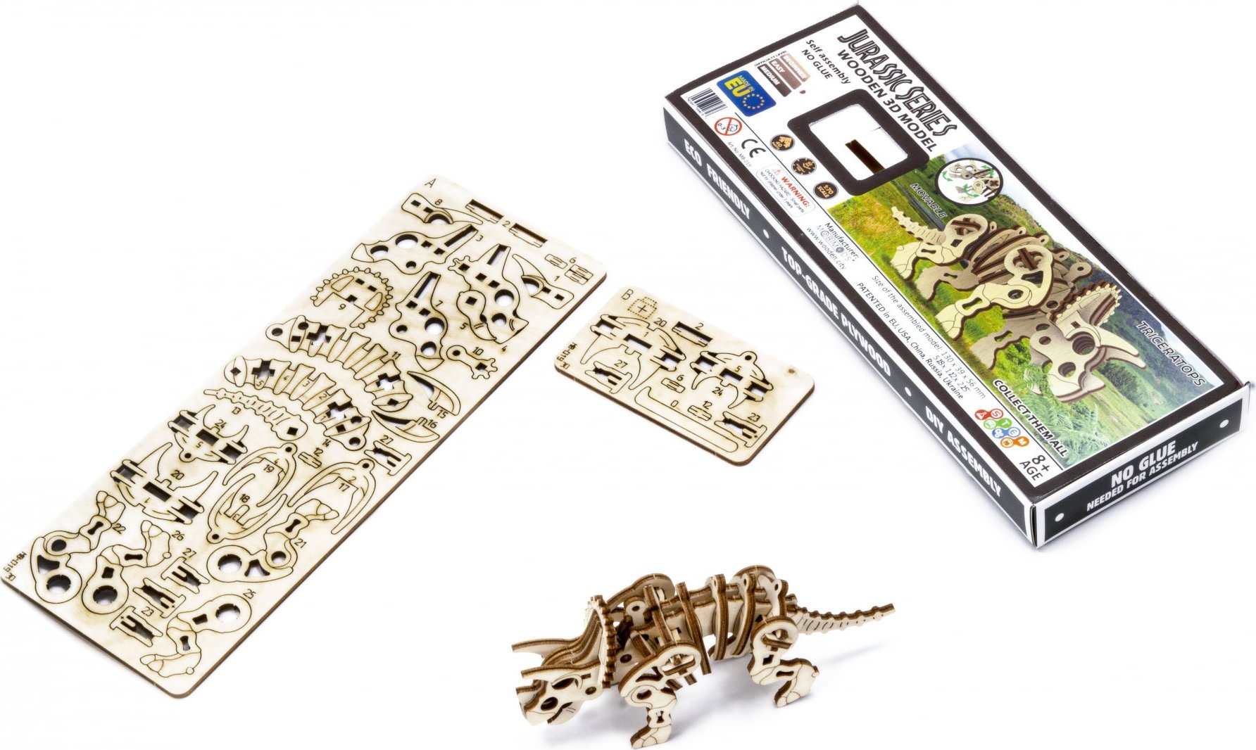 Drevená mechanická stavebnica z Jurskej série Triceratops je určená pre milovníkov pravekých tvorov. Po zostavení model vo vašich rukách ožije, má pohyblivú hlavu a končatiny. Vďaka jedinečnému dizajnu a prekvapivým detailom tohto modelu bude vaše skladanie plné zábavy. 3D puzzle WOODEN CITY Jurassic Series Triceratops je výborným darčekom pre každého milovníka dinosaurov. Obtiažnosť: 2 z 5 (podľa rozdelenia Wooden City) Orientačná doba na zloženie: 1 hodina Mierka: 1:70 Drevené 3D puzzle WOODEN CITY sú detailne prepracované funkčné mechanické modely, ktoré sa skladajú bez lepidla alebo náradia. Sú vyrobené z ekologických drevených materiálov - kvalitné brezové preglejky. S mechanickými drevenými puzzle WOODEN CITY zažijete hodiny zábavy pri skladaní a spoznáte prevody, gumičkové motory, ozubené kolieska a ďalšie súčiastky z bezprostrednej blízkosti. funkčný mechanický model skladania bez použitia lepidla alebo náradia kvalitné spracovanie z prírodného materiálu prepracované detaily vložený obrázkový návod na vnútornej strane obalu sú QR kódy pre zobrazenie návodu a inštruktážneho videa UPOZORNENIE: Na zostavenie je potrebné ulamovací nôž, nožnice, brúsny papier a sviečku z vosku ( nie je súčasťou výrobku). Pre správne fungovanie a bezproblémovú prevádzku je potrebné navoskovať pohyblivé časti modelu. Rozmer zloženého puzzle cca 13 x 3,9 x 5,6 cmVlastnosti