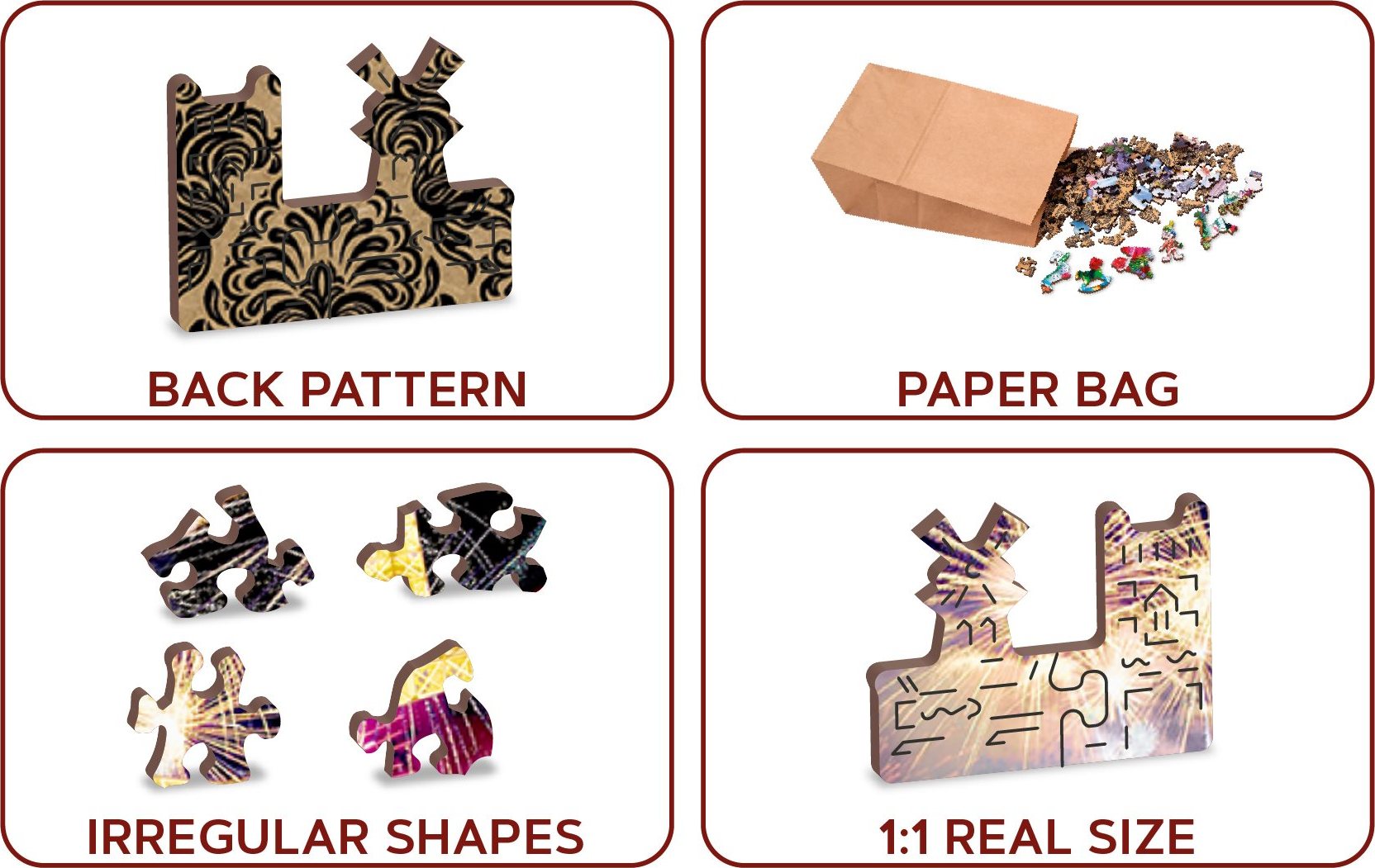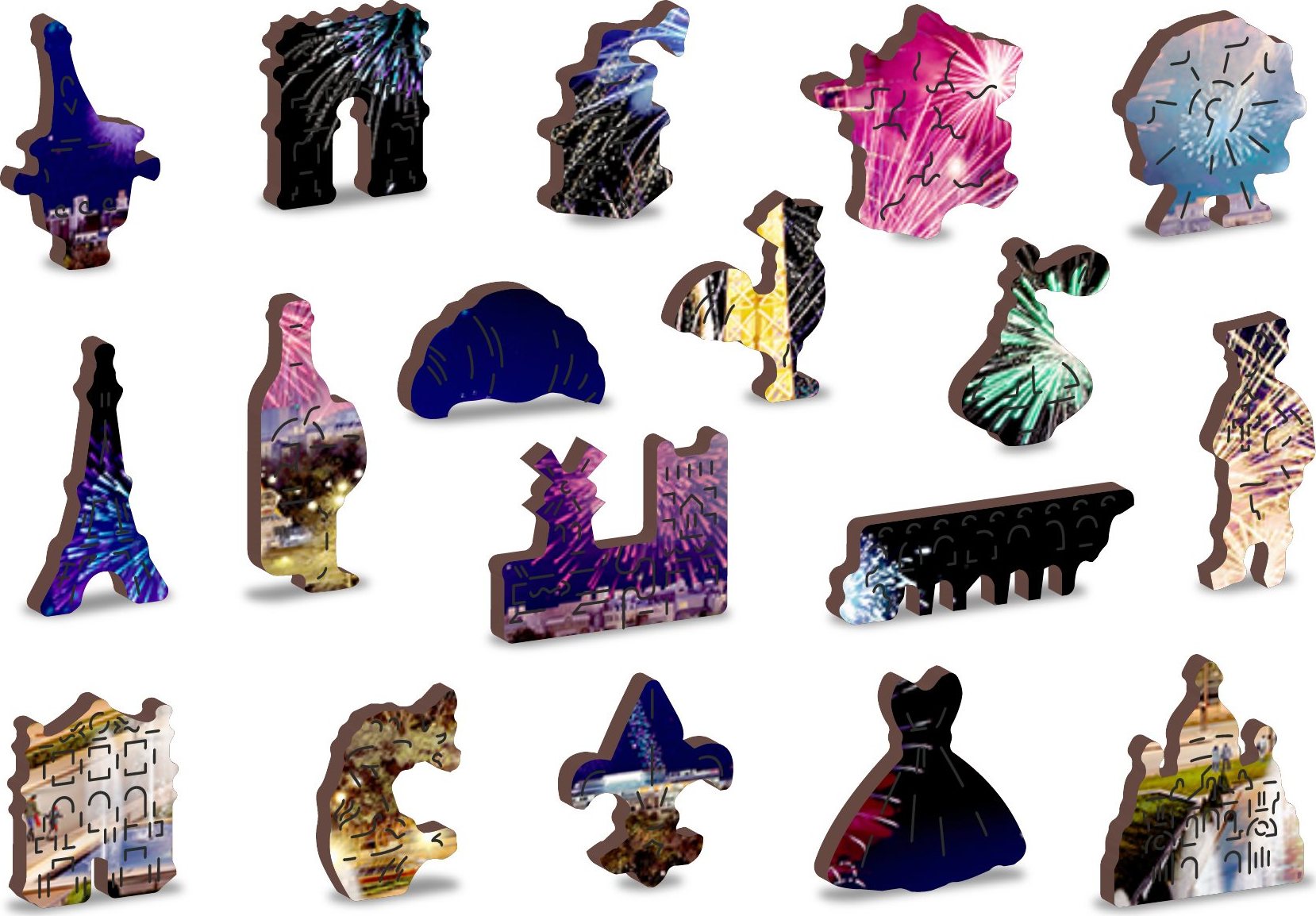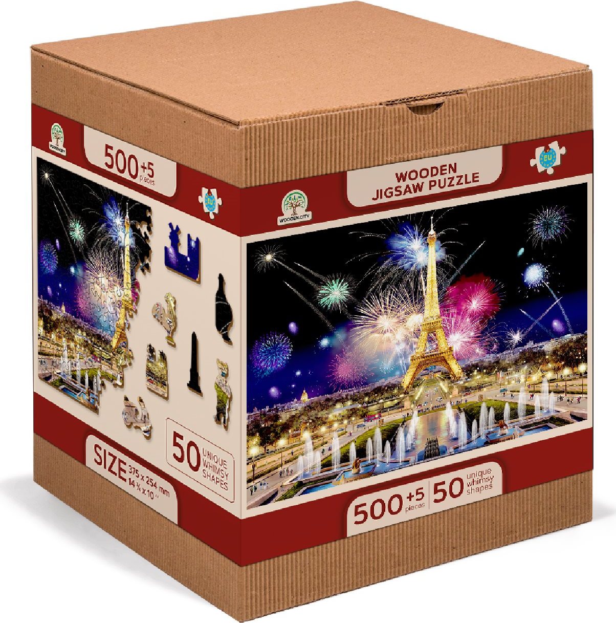 Laserom vyrezávané drevené puzzle WOODEN CITY so svojimi špeciálne tvarovanými dielikmi je neskutočne zábavné. Časť dielikov je vyrobená v tvare zvierat, stavieb alebo predmetov, ktorých výsledný efekt umocňujú laserom zvýraznené detaily. Tieto dieliky môžu samostatne stáť ako drobné figúrky. Skladanie puzzle s rôznorodými dielikmi je ťažšie a predstavuje väčšiu výzvu, než skladanie klasického puzzle. Puzzle je navyše obojstranné, skladať môžete ako podľa obrázku (lícová strana), tak podľa tvaru (rubová strana so vzorom). Značka WOODEN CITY okrem unikátneho konceptu puzzle nezabúda na ekológiu, u týchto výrobkov preto nenájdete žiadne plastové obaly. s unikátne tvarovanými dielikmi predstavujúce známe stavby, predmety alebo zvieratá podľa témy motívu vyššia obtiažnosť pri menšom počte dielikov - skladanie puzzle s rôznorodými dielikmi je náročnejšie obojstranné puzzle 2v1 - z jednej strany je obrázok, z druhej opakujúci sa vzor na skladanie podľa tvaru hladkej hrany bez triesok vďaka precíznemu laserovému spracovaniu vyrobené z pevnej drevovláknitej HDF dosky o sile 3-4mm vo vnútri balenia je samostatná predloha na skladanie EKO Friendly 100% bez plastových obalov - puzzle je v papierovom sáčku vo vnútri papierovej krabičky vhodný darček pre akúkoľvek príležitosť Veľkosť: L Počet dielikov celkom : 505 Unikátne tvarované dieliky: 50 Rozmer zloženého puzzle cca 37,5 x 25,4 cmVlastnosti
