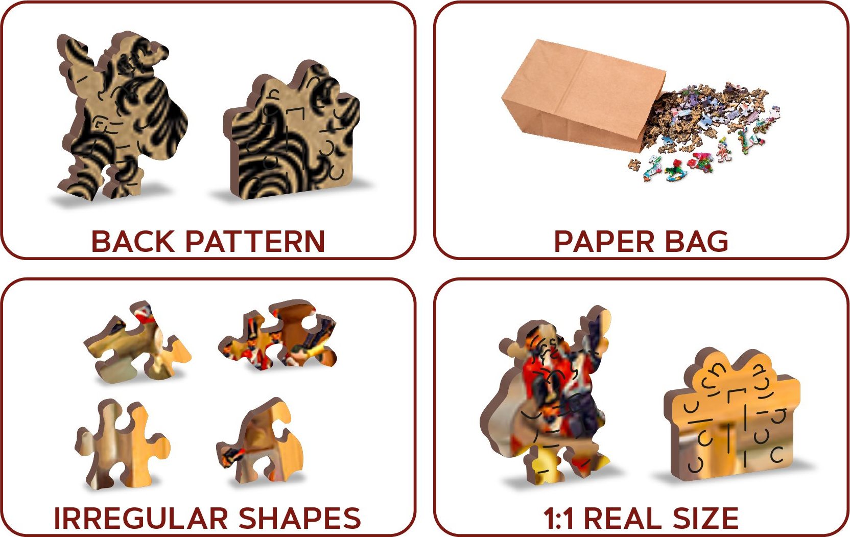 Laserom vyrezávané drevené puzzle WOODEN CITY so svojimi špeciálne tvarovanými dielikmi je neskutočne zábavné. Časť dielikov je vyrobená v tvare zvierat, stavieb alebo predmetov, ktorých výsledný efekt umocňujú laserom zvýraznené detaily. Tieto dieliky môžu samostatne stáť ako drobné figúrky. Skladanie puzzle s rôznorodými dielikmi je ťažšie a predstavuje väčšiu výzvu, než skladanie klasického puzzle. Puzzle je navyše obojstranné, skladať môžete ako podľa obrázku (lícová strana), tak podľa tvaru (rubová strana so vzorom). Značka WOODEN CITY okrem unikátneho konceptu puzzle nezabúda na ekológiu, u týchto výrobkov preto nenájdete žiadne plastové obaly. s unikátne tvarovanými dielikmi predstavujúce známe stavby, predmety alebo zvieratá podľa témy motívu vyššia obtiažnosť pri menšom počte dielikov - skladanie puzzle s rôznorodými dielikmi je náročnejšie obojstranné puzzle 2v1 - z jednej strany je obrázok, z druhej opakujúci sa vzor na skladanie podľa tvaru hladkej hrany bez triesok vďaka precíznemu laserovému spracovaniu vyrobené z pevnej drevovláknitej HDF dosky o sile 3-4mm vo vnútri balenia je samostatná predloha na skladanie EKO Friendly 100% bez plastových obalov - puzzle je v papierovom sáčku vo vnútri papierovej krabičky vhodný darček pre akúkoľvek príležitosť Veľkosť: XL Počet dielikov celkom : 1010 Unikátne tvarované dieliky: 100 Rozmer zloženého puzzle cca 51,9 x 37,5 cmVlastnosti