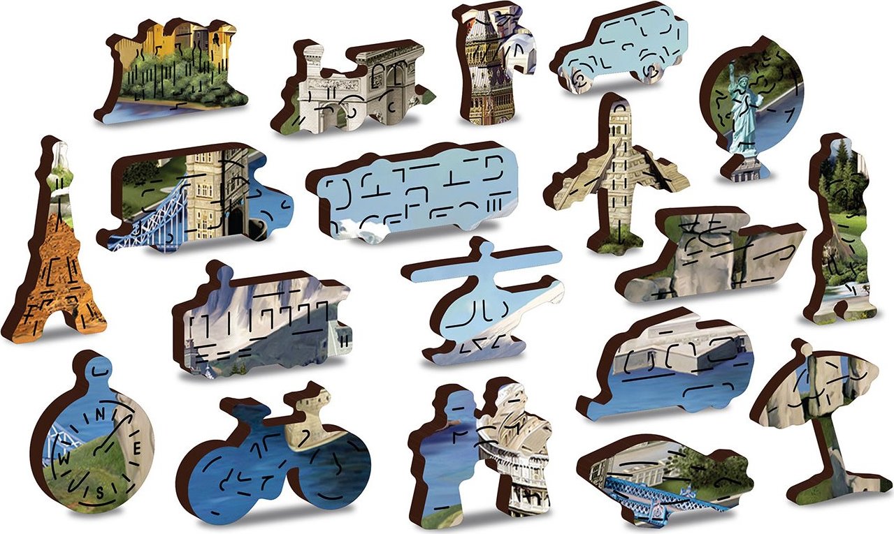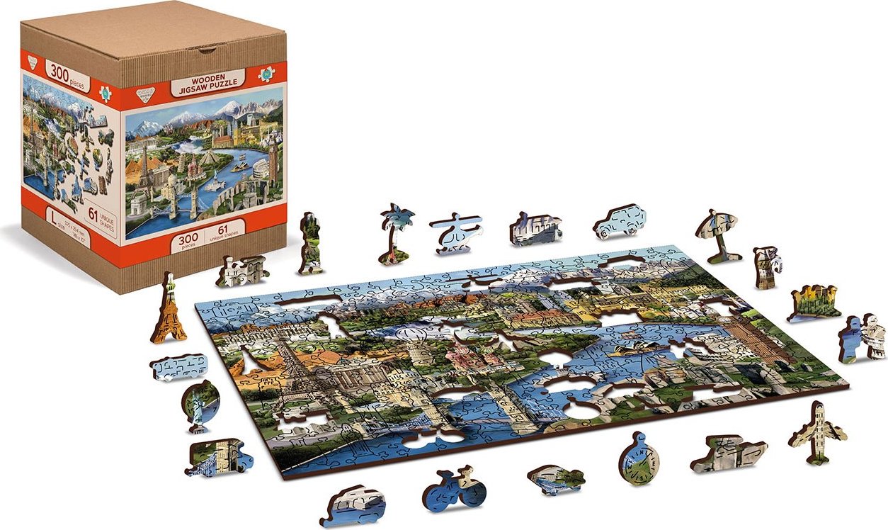 Upozornenie: Fotografie puzzle s dielikmi sú ilustratívne, môžu zobrazovať variant s odlišným počtom dielikov. Celkový počet dielikov je vždy uvedený v názve výrobku, výsledný rozmer obrázku a počet unikátne tvarovaných dielikov je uvedený v popise. Laserom vyrezávané drevené puzzle WOODEN CITY so svojimi špeciálne tvarovanými dielikmi je neskutočne zábavné. Časť dielikov je vyrobená v tvare zvierat, stavieb alebo predmetov, ktorých výsledný efekt umocňujú laserom zvýraznené detaily. Tieto dieliky môžu samostatne stáť ako drobné figúrky. Skladanie puzzle s rôznorodými dielikmi je ťažšie a predstavuje väčšiu výzvu, než skladanie klasického puzzle. Puzzle je navyše obojstranné, skladať môžete ako podľa obrázku (lícová strana), tak podľa tvaru (rubová strana so vzorom). Značka WOODEN CITY okrem unikátneho konceptu puzzle nezabúda na ekológiu, u týchto výrobkov preto nenájdete žiadne plastové obaly. s unikátne tvarovanými dielikmi predstavujúce známe stavby, predmety alebo zvieratá podľa témy motívu vyššia obtiažnosť pri menšom počte dielikov - skladanie puzzle s rôznorodými dielikmi je náročnejšie obojstranné puzzle 2v1 - z jednej strany je obrázok, z druhej opakujúci sa vzor na skladanie podľa tvaru hladkej hrany bez triesok vďaka precíznemu laserovému spracovaniu vyrobené z pevnej drevovláknitej HDF dosky o sile 3-4mm vo vnútri balenia je samostatná predloha na skladanie EKO Friendly 100% bez plastových obalov - puzzle je v papierovom sáčku vo vnútri papierovej krabičky vhodný darček pre akúkoľvek príležitosť Veľkosť: L Počet dielikov celkom : 300 Unikátne tvarované dieliky: 61 Orientačná doba na zloženie: 120-180 minút Rozmer zloženého puzzle cca 37,5 x 25,4 cmVlastnosti