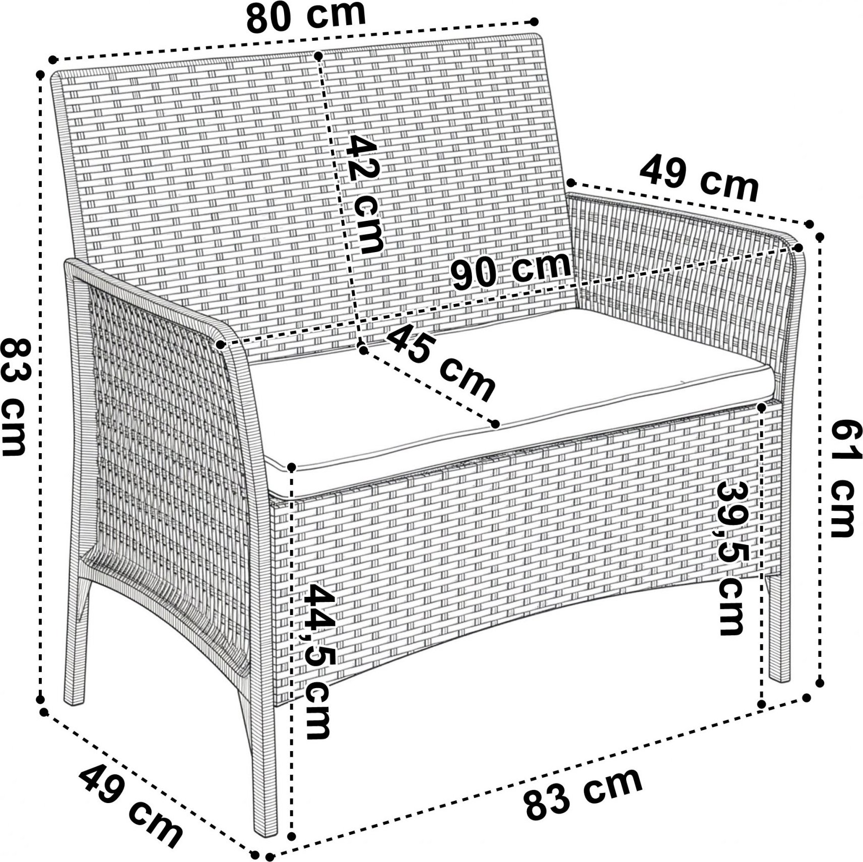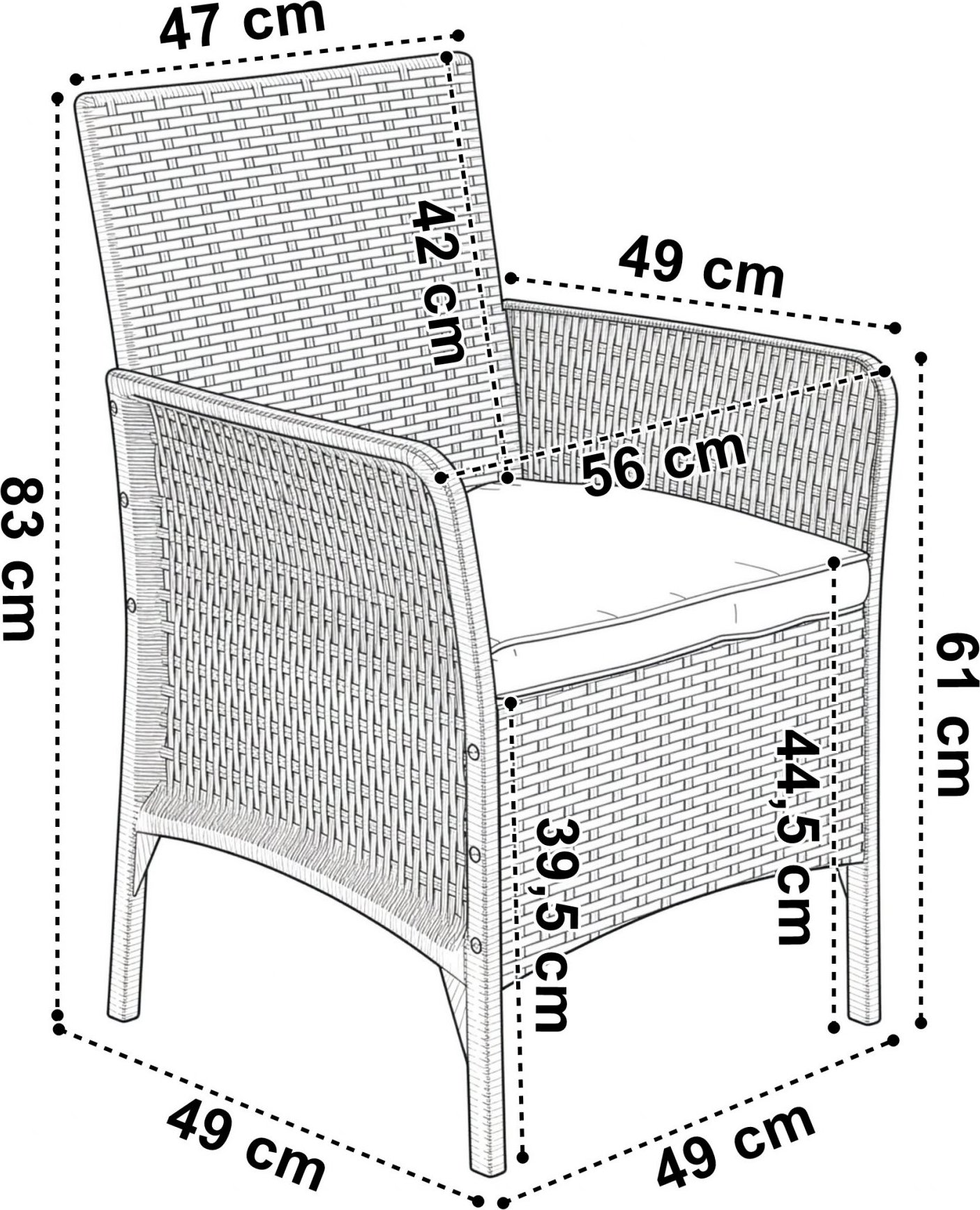 - výška sedadla s vankúšom: 44,5 cm