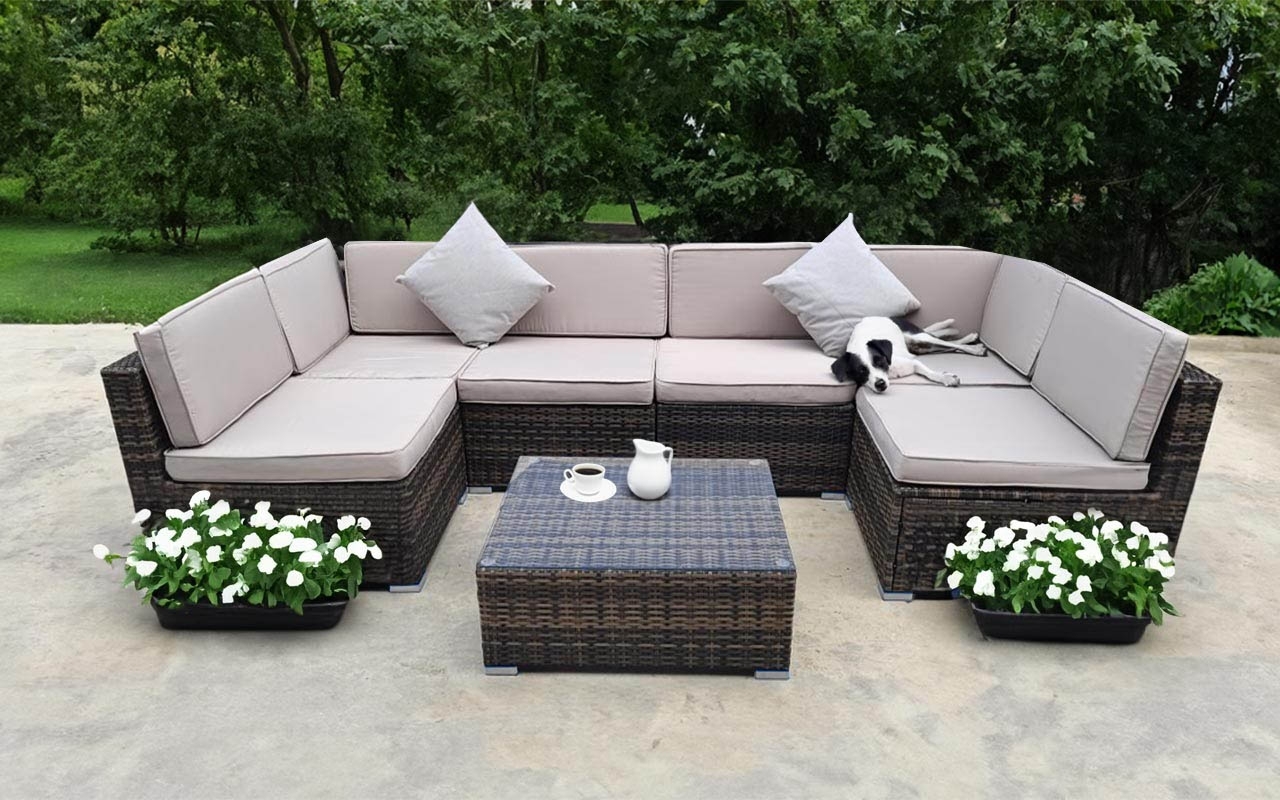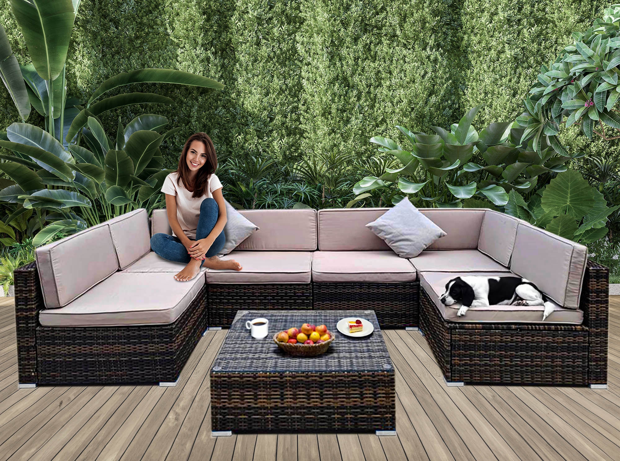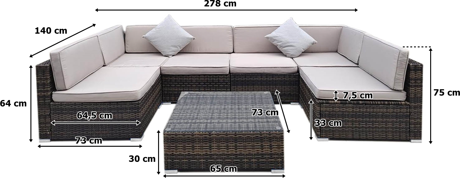 Zostava skladajúca sa zo 7 modulárnych prvkov vám umožní vytvoriť ako priestrannú rohovú pohovku, tak aj pohovku s kreslami - všetko si upravíte podľa svojich potrieb a preferencií. Každý prvok je vybavený mäkkými sedákmi a operadlami, ktoré zaistia relaxáciu na najvyššej úrovni. Či už sedíte s knihou alebo pozývate priateľov na kávu, tieto vankúšiky vám spríjemnia každú chvíľu strávenú vonku.