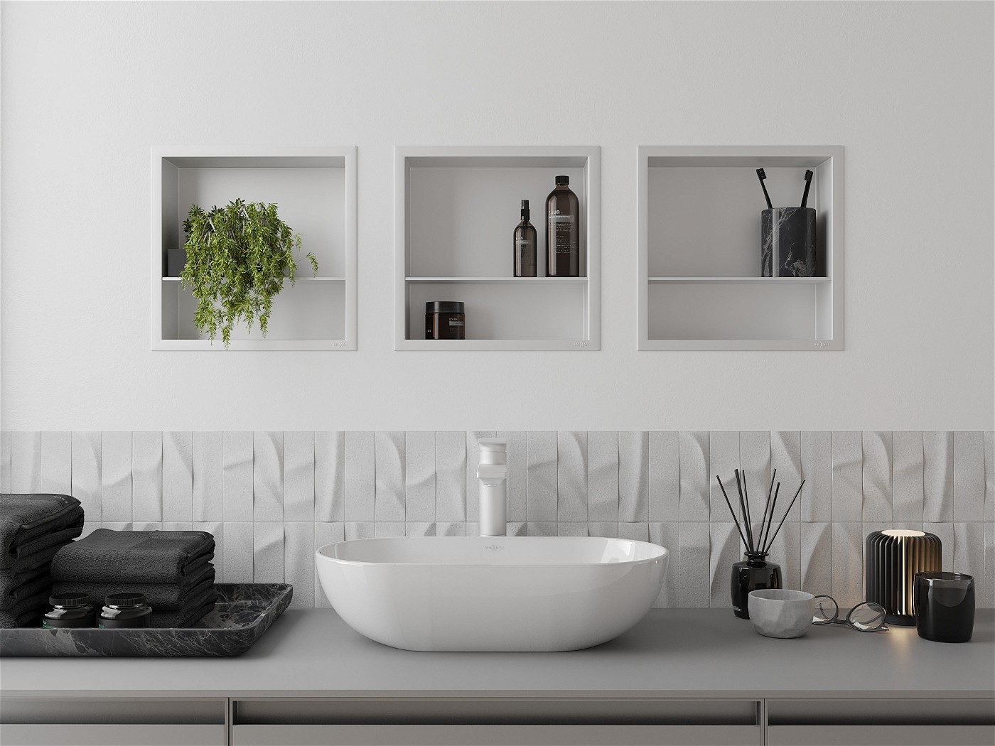 Podomietková polica vyrobená z nerezovej ocele s bielou povrchovou úpravou ponúkne jednoduché riešenie na uskladnenie kozmetických potrieb, ktoré zaberie minimum miesta v priestore. Policu totiž ľahko zabudujete priamo do steny. Vďaka použitým materiálom teda veľmi dobre odoláva vlhkosti.