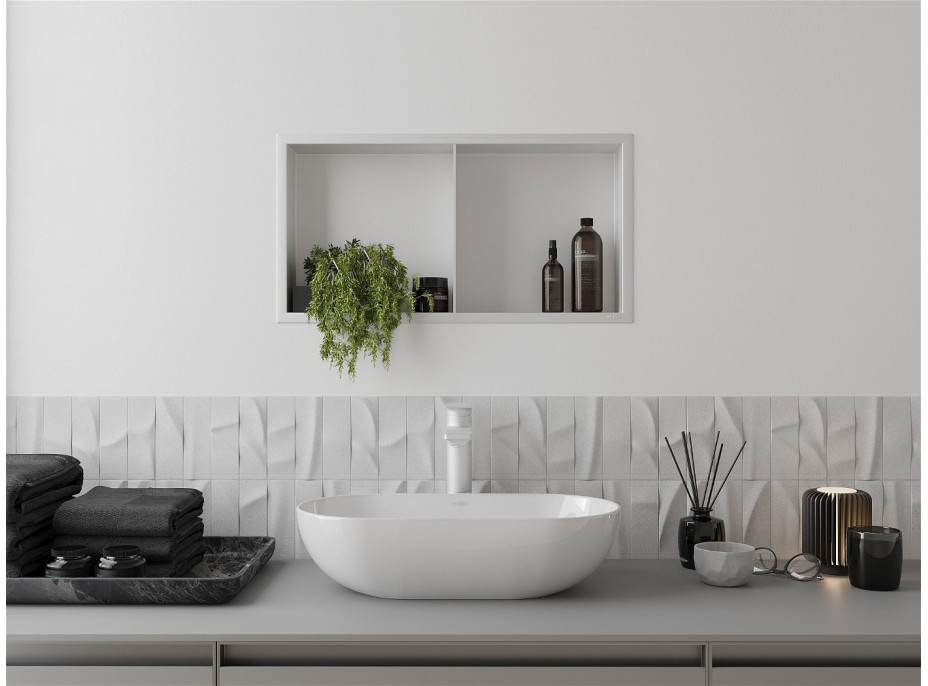 Podomietková polica vyrobená z nerezovej ocele s bielou povrchovou úpravou ponúkne jednoduché riešenie na uskladnenie kozmetických potrieb, ktoré zaberie minimum miesta v priestore. Policu totiž ľahko zabudujete priamo do steny. Vďaka použitým materiálom teda veľmi dobre odoláva vlhkosti.