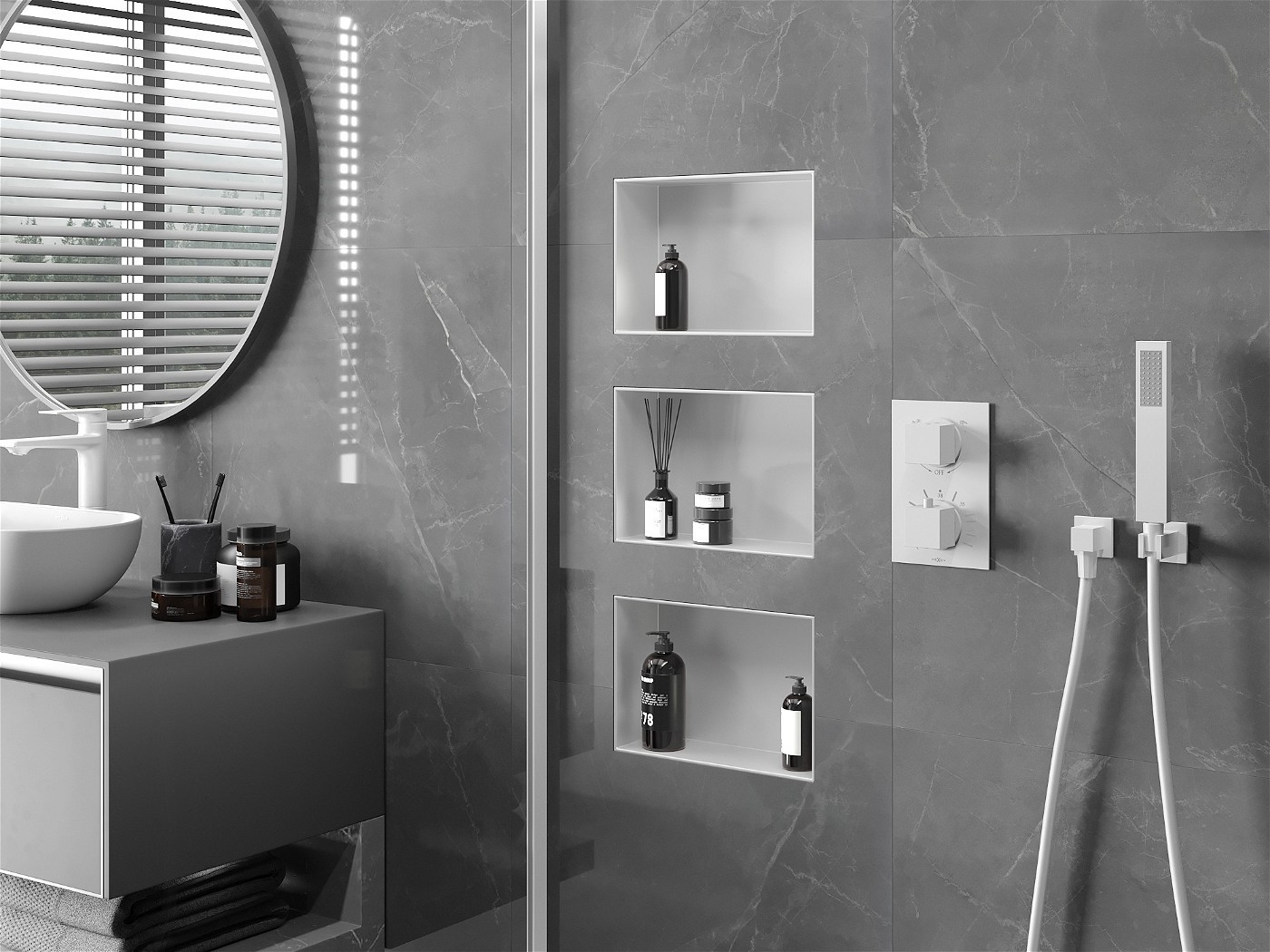 Podomietková polica vyrobená z nerezovej ocele s bielou povrchovou úpravou ponúkne jednoduché riešenie na uskladnenie kozmetických potrieb, ktoré zaberie minimum miesta v priestore. Policu totiž ľahko zabudujete priamo do steny a vďaka podomietkovému golieru ju obložíte kachličkami alebo omietkou. Vďaka použitým materiálom teda veľmi dobre odoláva vlhkosti.