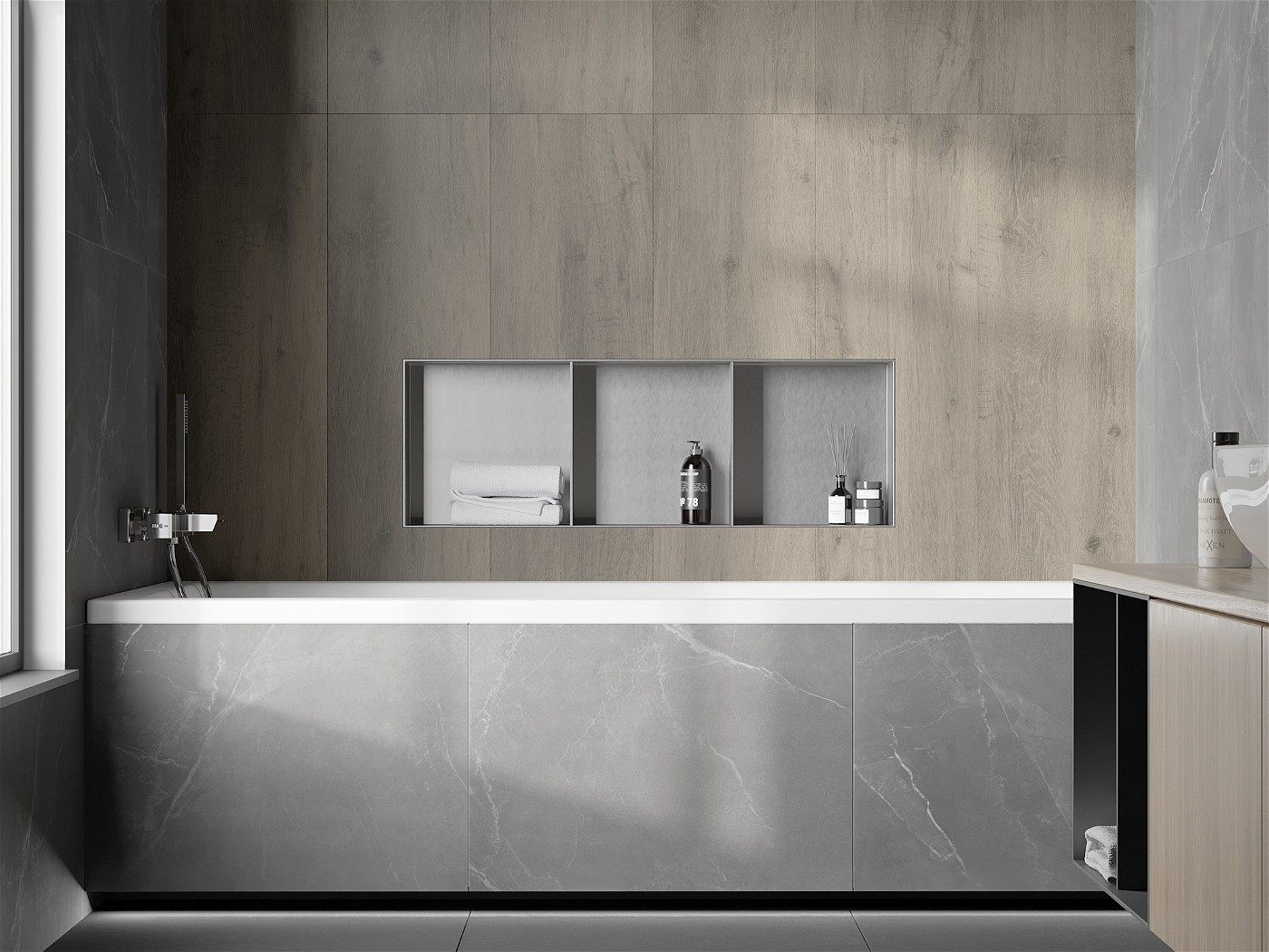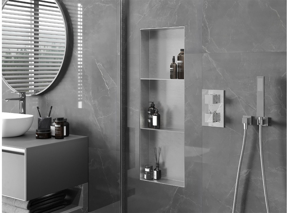 Podomietková polica vyrobená z nerezovej ocele s brúsenou chrómovou (INOX) povrchovou úpravou ponúkne jednoduché riešenie pre uskladnenie kozmetických potrieb, ktoré zaberie minimum miesta v priestore. Policu totiž ľahko zabudujete priamo do steny a vďaka podomietkovému golieru ju obložíte kachličkami alebo omietkou. Vďaka použitým materiálom teda veľmi dobre odoláva vlhkosti.