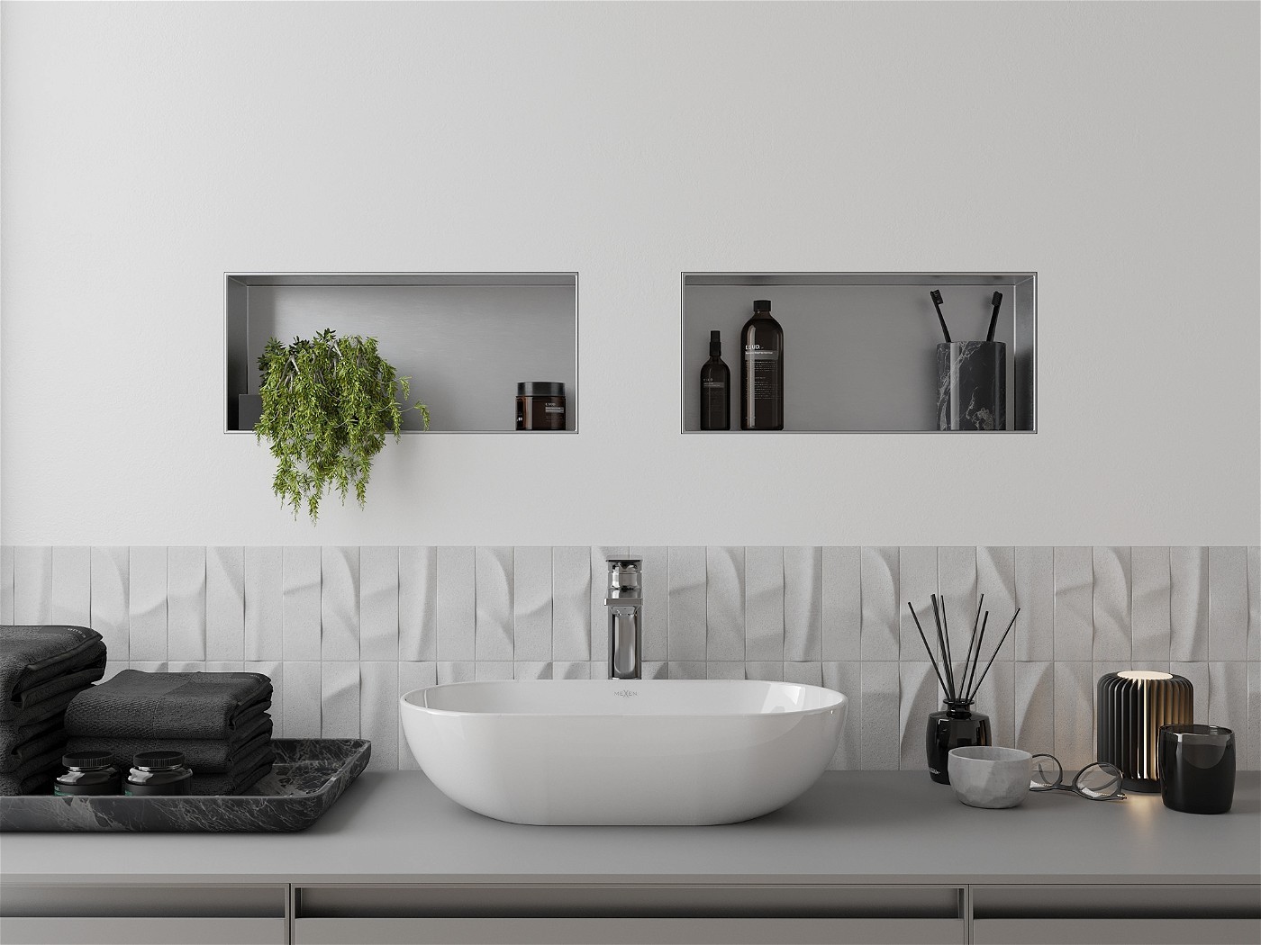 Podomietková polica vyrobená z nerezovej ocele s brúsenou chrómovou (INOX) povrchovou úpravou ponúkne jednoduché riešenie pre uskladnenie kozmetických potrieb, ktoré zaberie minimum miesta v priestore. Policu totiž ľahko zabudujete priamo do steny a vďaka podomietkovému golieru ju obložíte kachličkami alebo omietkou. Vďaka použitým materiálom teda veľmi dobre odoláva vlhkosti.