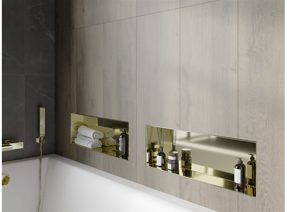 Podomietková polica vyrobená z nerezovej ocele so zlatou lesklou povrchovou úpravou ponúkne jednoduché riešenie na uskladnenie kozmetických potrieb, ktoré zaberie minimum miesta v priestore. Policu totiž ľahko zabudujete priamo do steny a vďaka podomietkovému golieru ju obložíte kachličkami alebo omietkou. Vďaka použitým materiálom teda veľmi dobre odoláva vlhkosti.