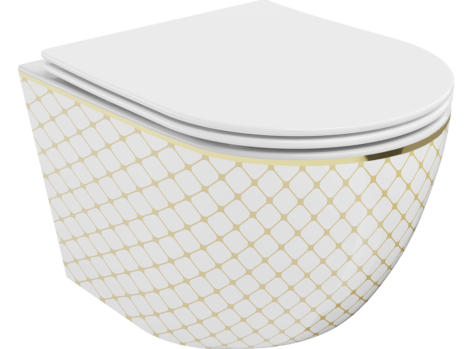 Závesné WC LENA RIMLESS - biele/zlaté vzorované + Duroplast sedátko slim