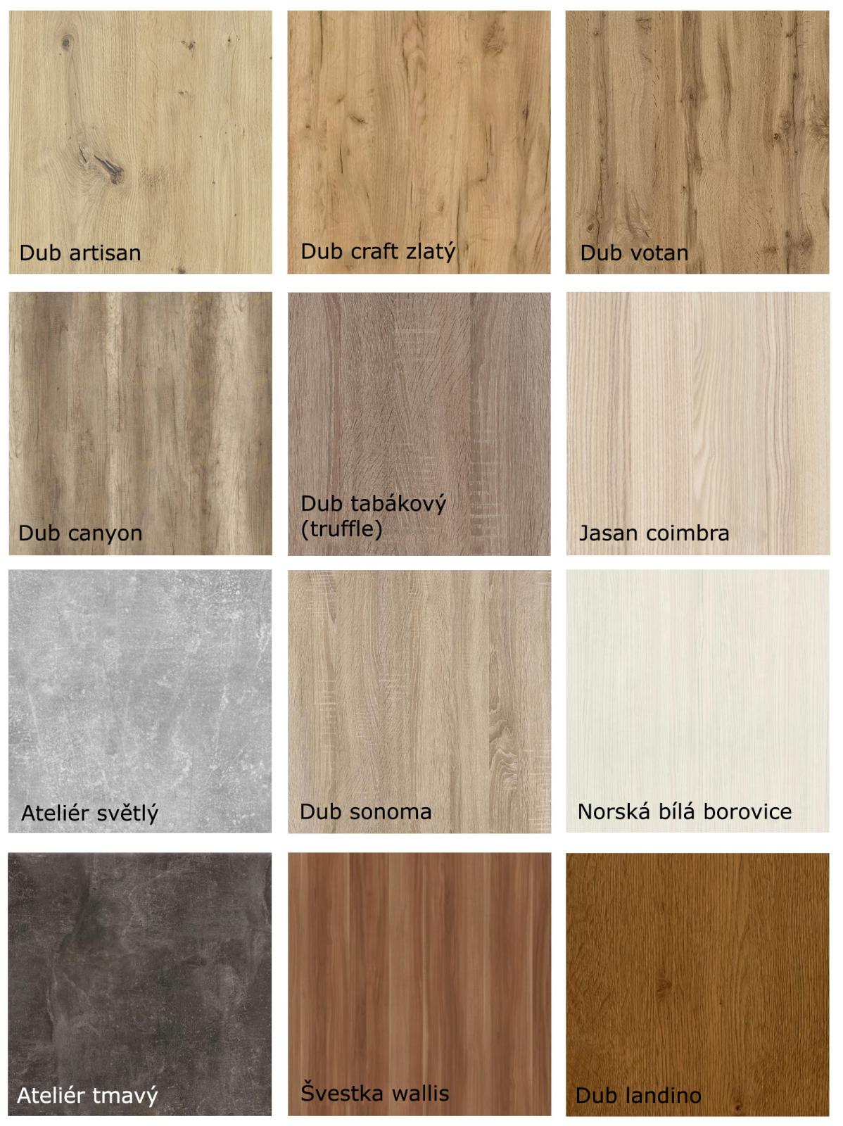 Vybrať si môžete z množstva dekorov, aby ste dokonale zladili stolík s obývacou izbou. Na výber máte z tmavého wenge, orecha wenge, arusha wenge, orecha Ecco, duba Landin, tmavého orecha, duba sonoma, jaseňa coimbra, duba sonoma tabakového, calvados, slivky, jelša, čiernej matnej farby, nórskej borovice čierne alebo biele, dubu san remo alebo veľmi obľúbeného dubu craft zlatého, ktorý nájdete aj na fotografiách produktu.
