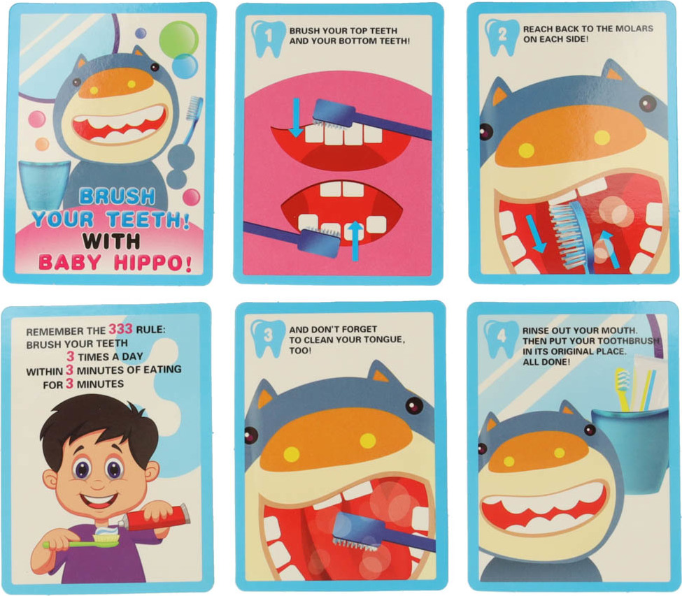 - Karty v angličtine znázorňujúce kroky pri čistení zubov