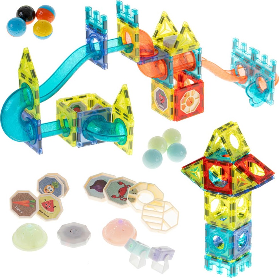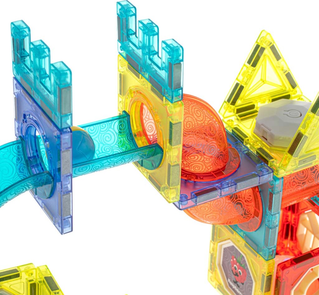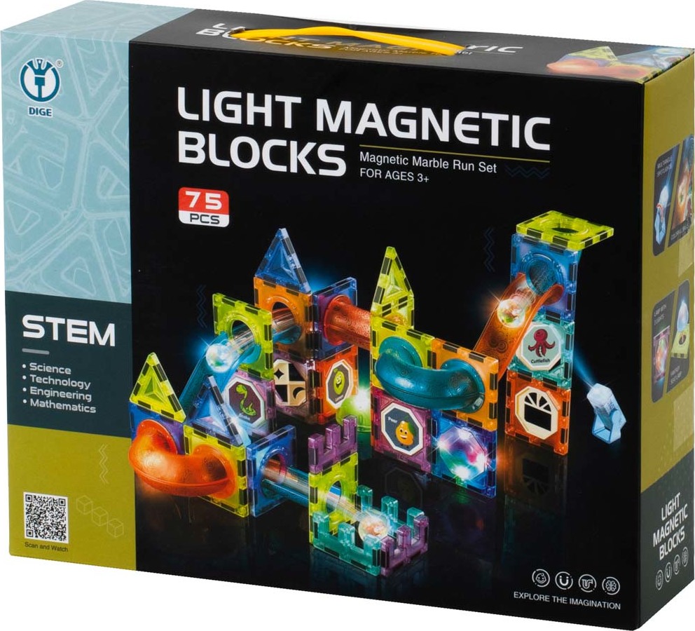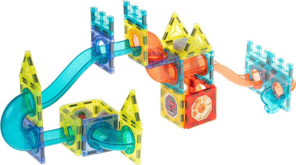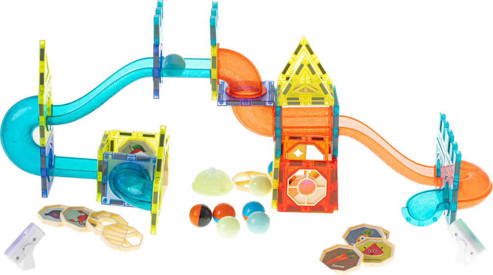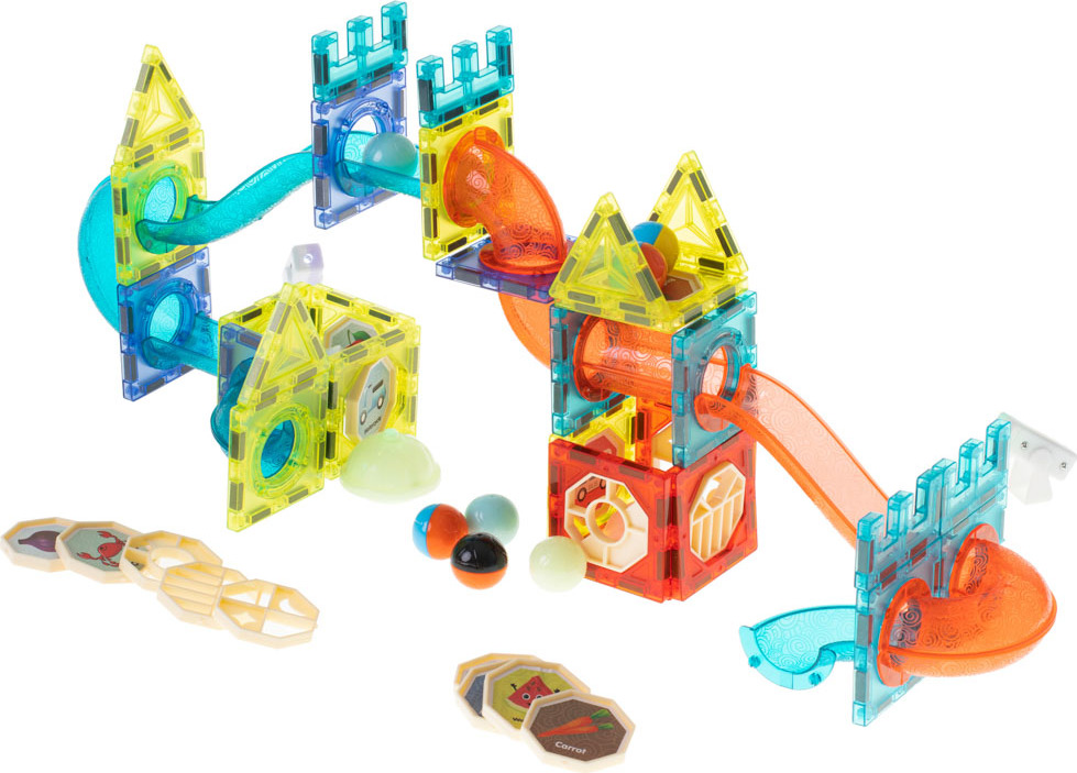Vytvorte si vlastnú guličkovú dráhu! Fantastické farebné kocky s mnohými tunelmi a šmykľavkami, ktoré zaručujú zábavu na dlhé hodiny. Kombináciou prvkov sa dokonale rozvíja manuálna zručnosť, drobná motorika a presnosť prstov . A plánovanie následných stavieb tak, aby bola konštrukcia trvanlivá, podnecuje priestorovú predstavivosť a učí logickému mysleniu . Všetky prvky je možné ľubovoľne kombinovať - to podporuje kreatívne myslenie a vytváranie nových konštrukcií. Príjemné farby a samolepky so zvieratkami nabádajú deti k hre. Každý blok sa spája pomocou vstavaných magnetov, takže stavba aj tých najnápaditejších stavieb je čistá zábava. Sada obsahuje guličky, ktoré sa pri uvedení do pohybu rozsvietia, a reflektory, ktoré vytvorené konštrukcie osvetlia. To všetko zaručí, že stavba bude v noci vyzerať krásne. Sledovanie pohybu loptičiek po skonštruovanej dráhe stimuluje vizuálne vnímanie a rozvíja pozorovacie schopnosti.